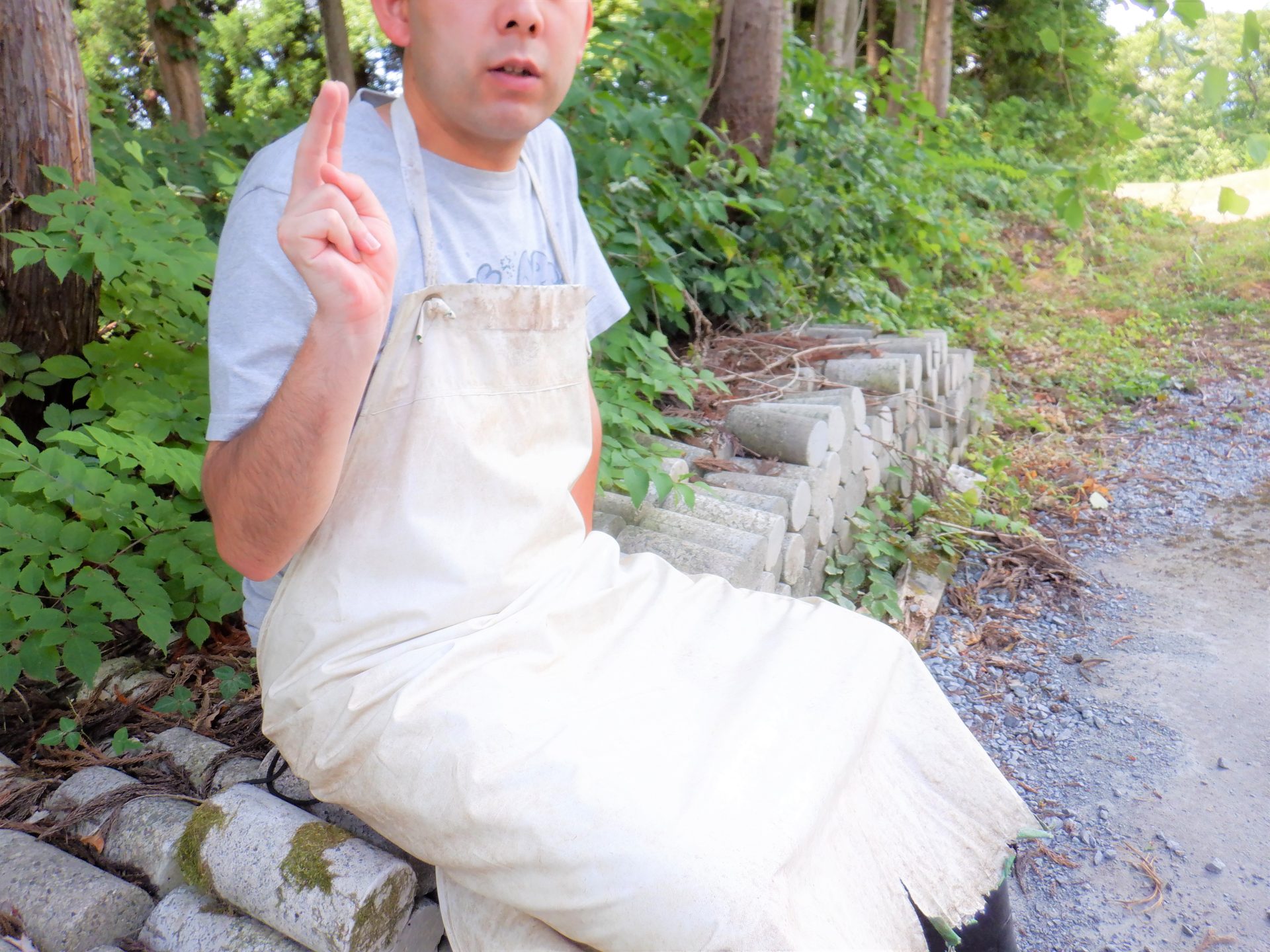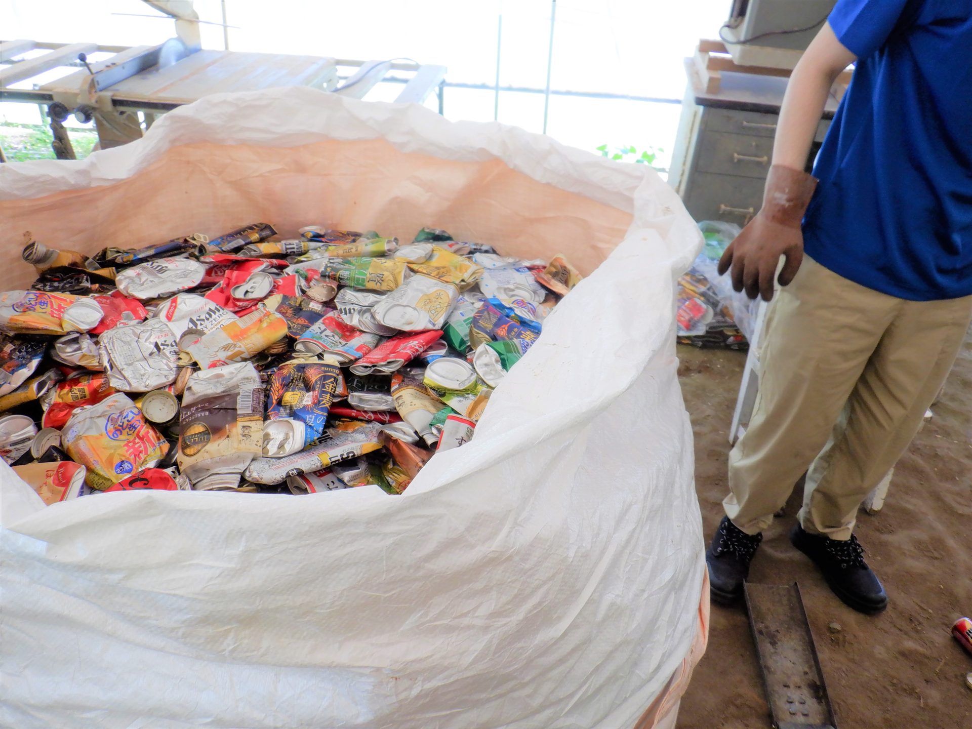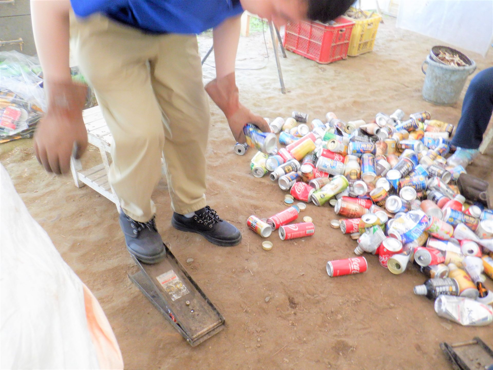 畑の隣のハウスでは今日も空き缶つぶしに精が出ます~蚊取り線香は必需品!