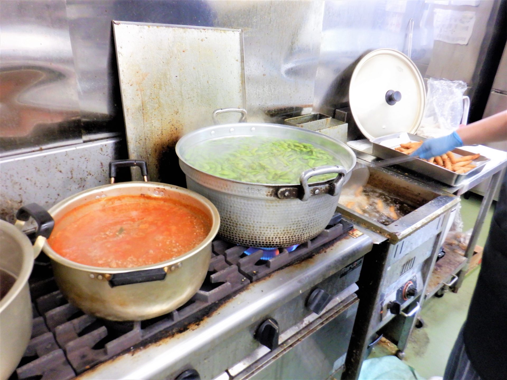 - 豆の大鍋の隣は何?さらに揚げ物も!