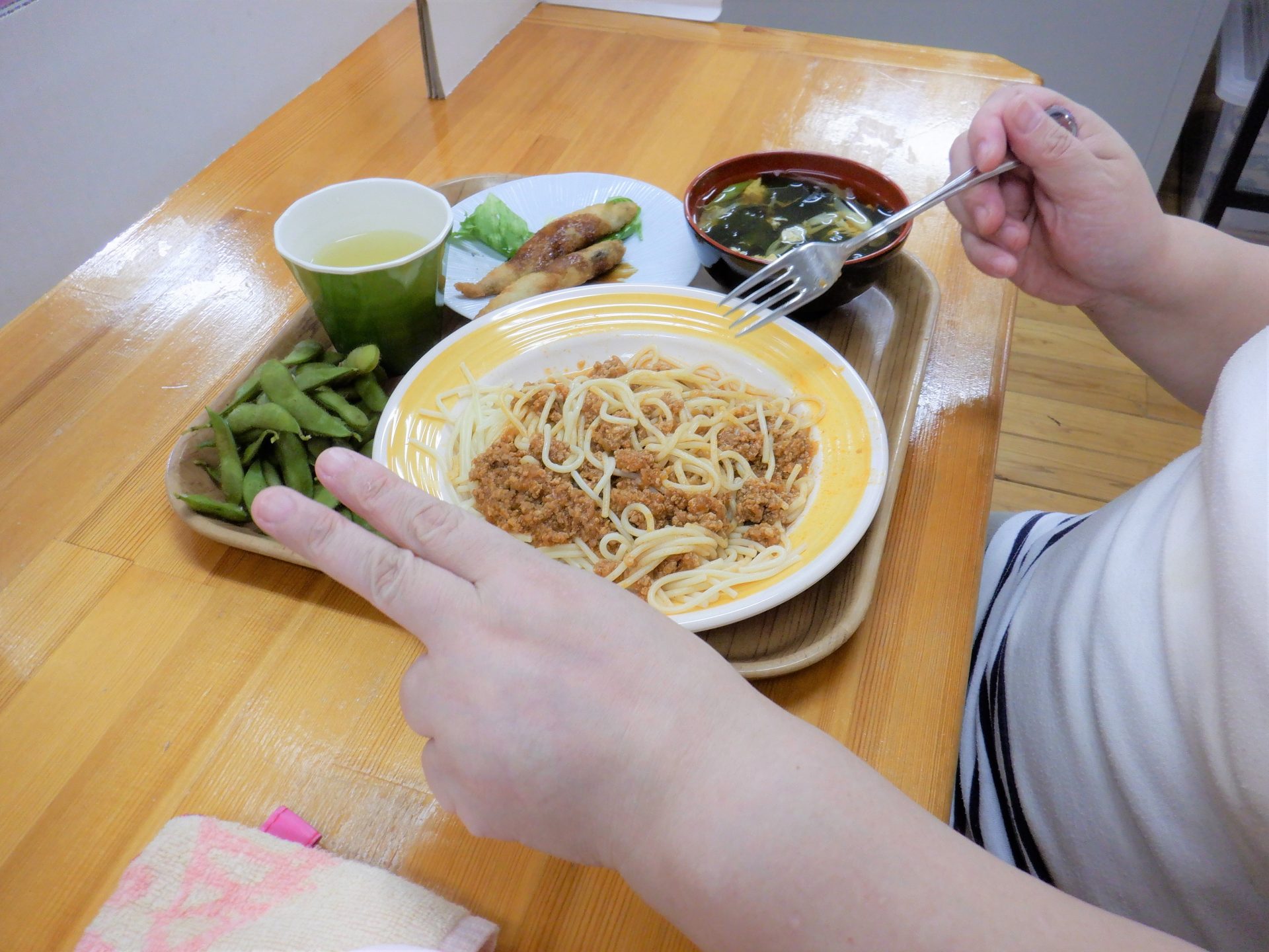 ミートソースパスタ&ししゃもフラ&磯香スープ&枝豆~♡豪華♡