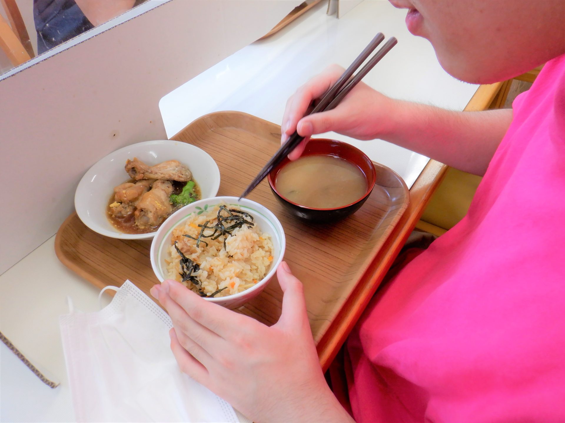 じゃ~ん!炊き込みご飯に鶏手羽の煮物とナス汁~( *´艸`)