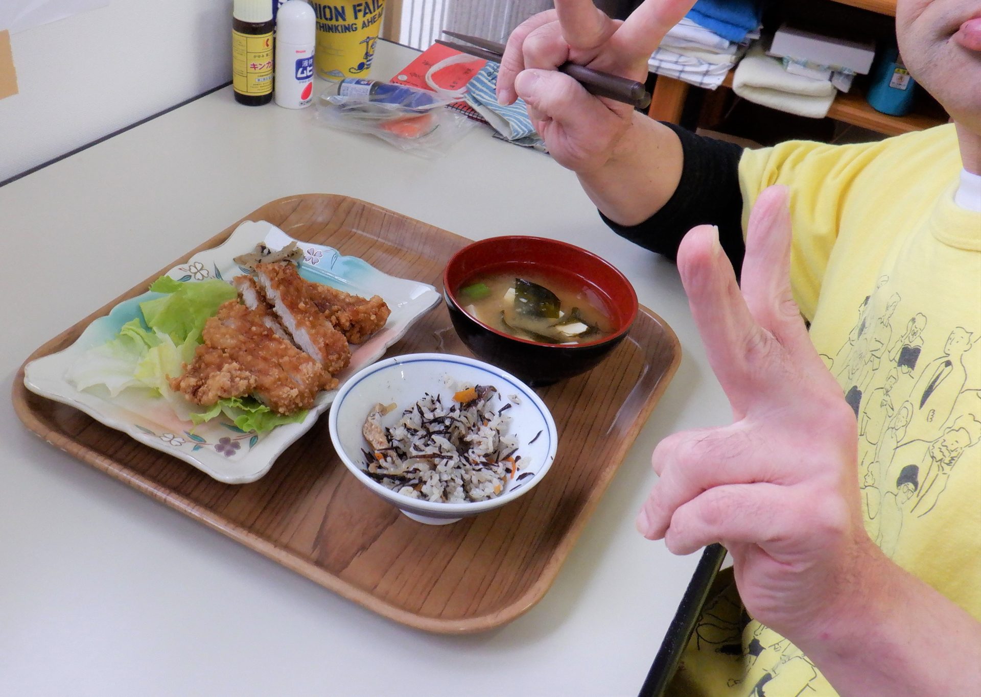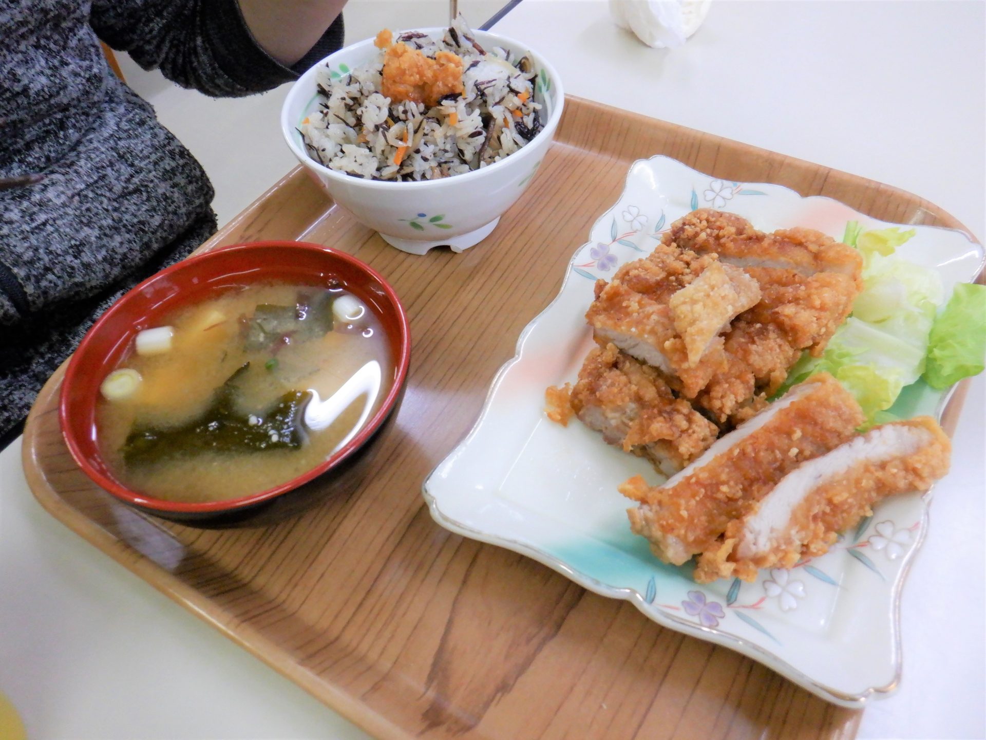 - ご飯の真ん中に…竜田揚げ?!