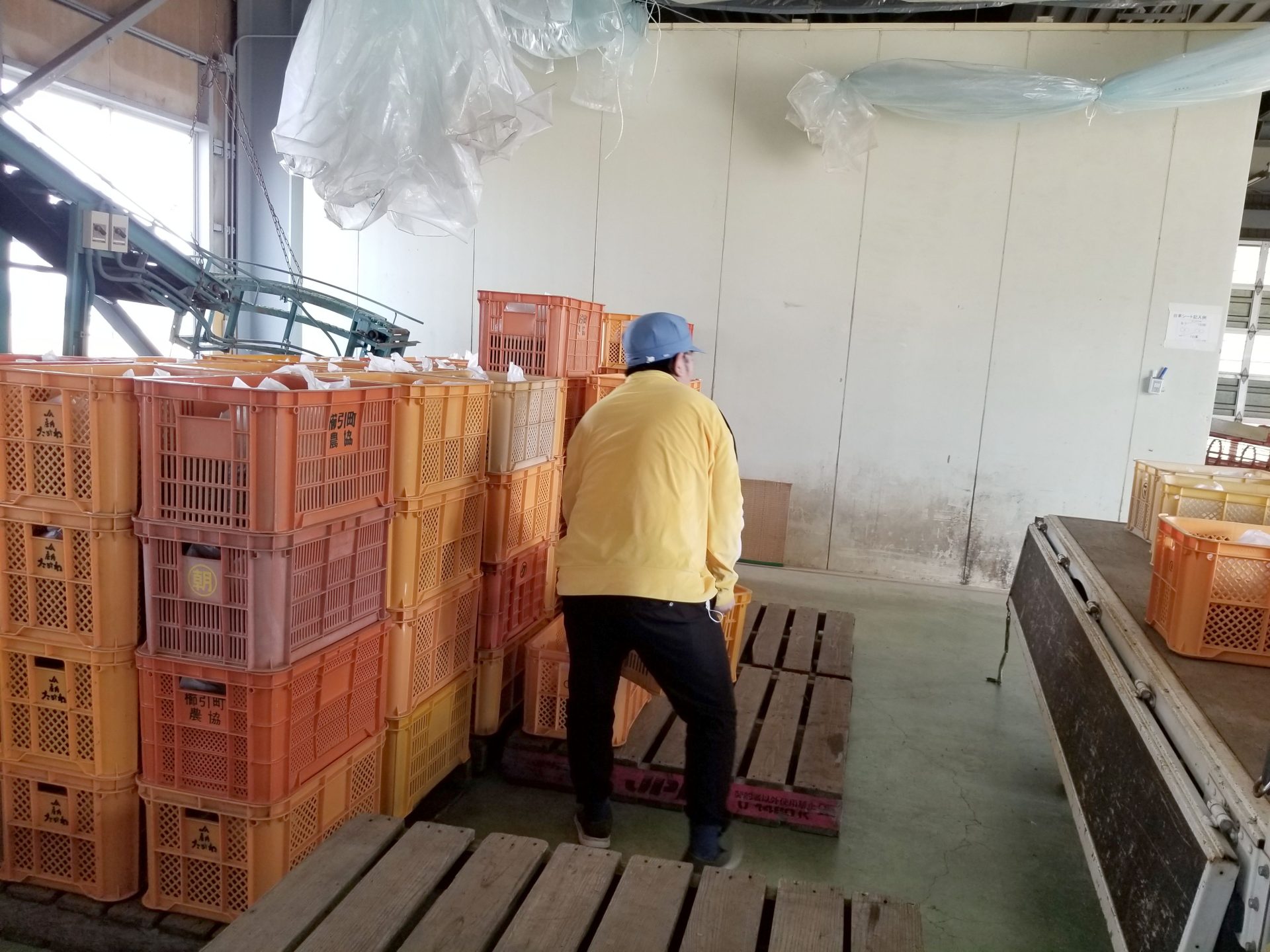 その頃菌床センターでは…利用者さんが昨日の空のコンテナをトラックから降ろしています~