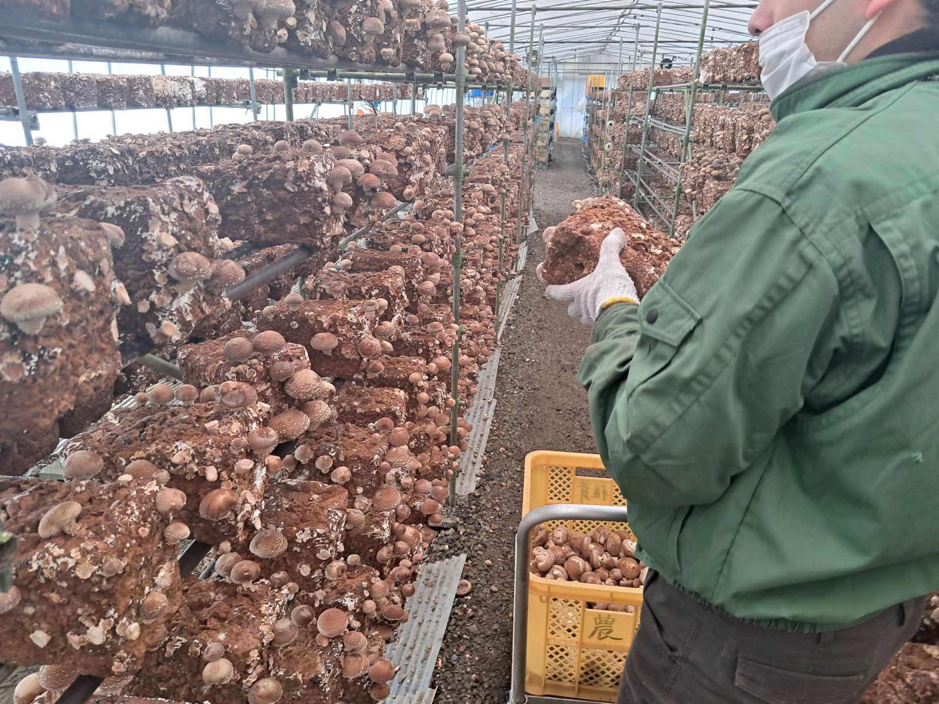 ハウスでは新しい菌床を運んでいました~(´▽`*)