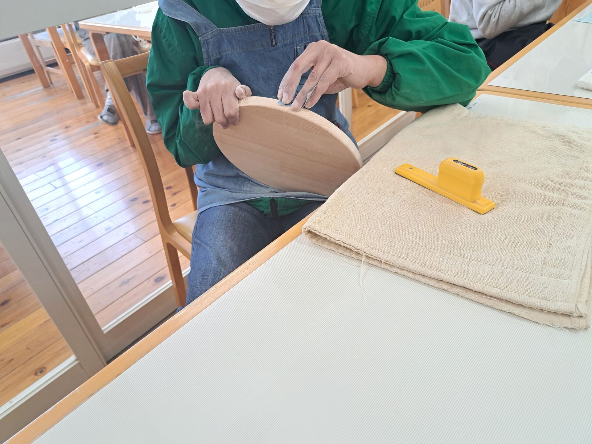 木工班は今日は食堂ホールでお仕事開始!