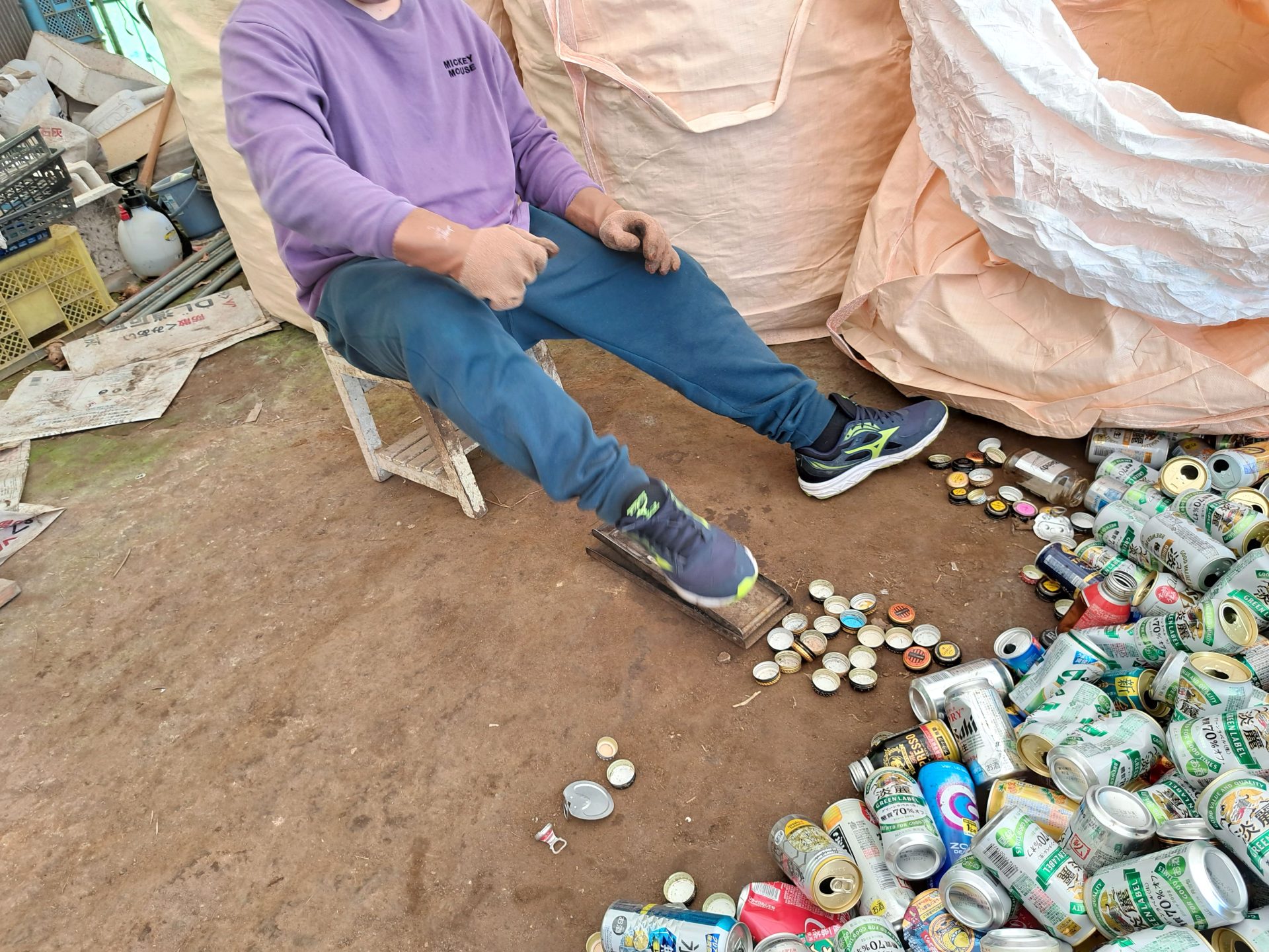 ハウスでは木工班メンバーが空き缶つぶし中~