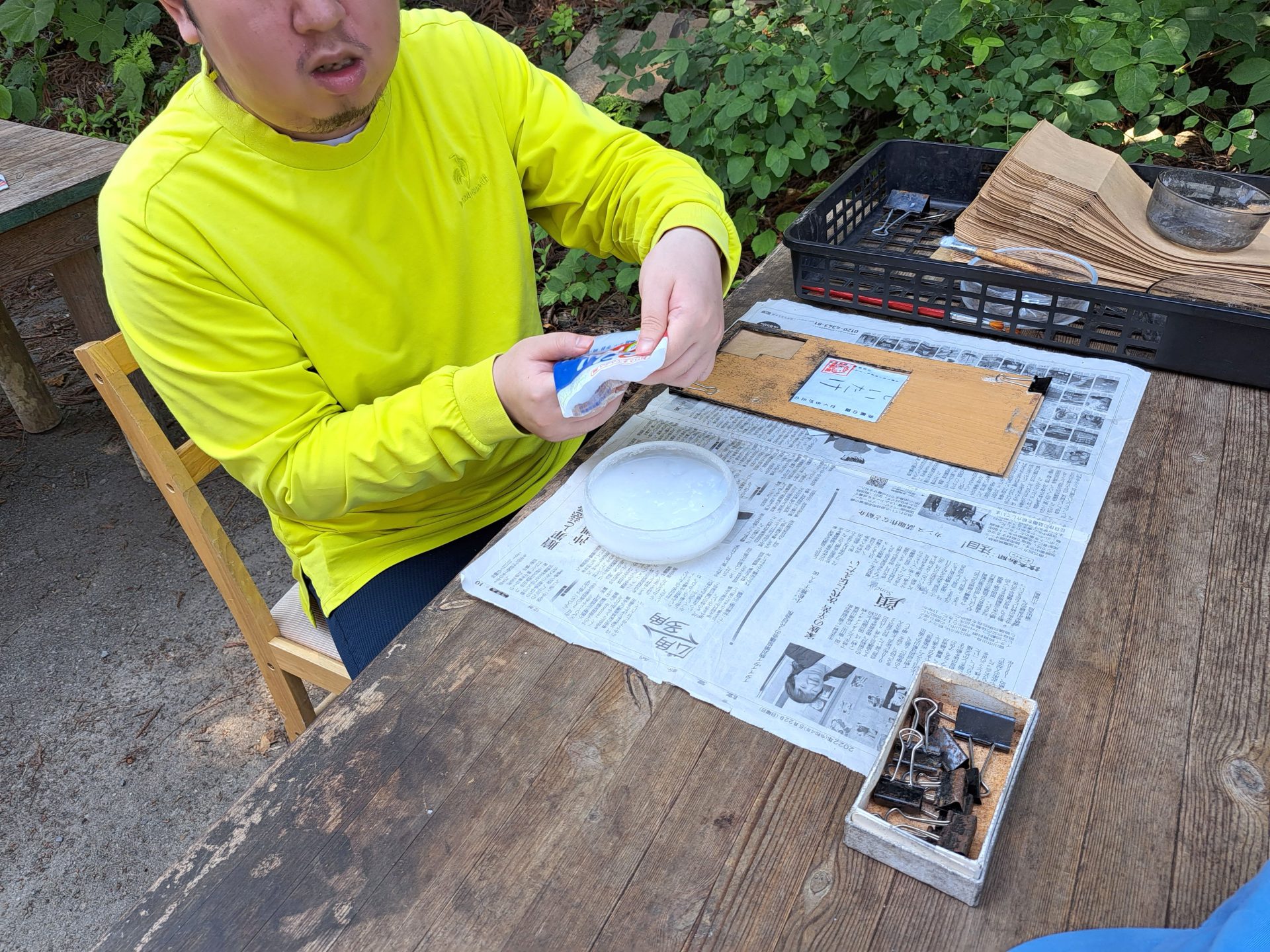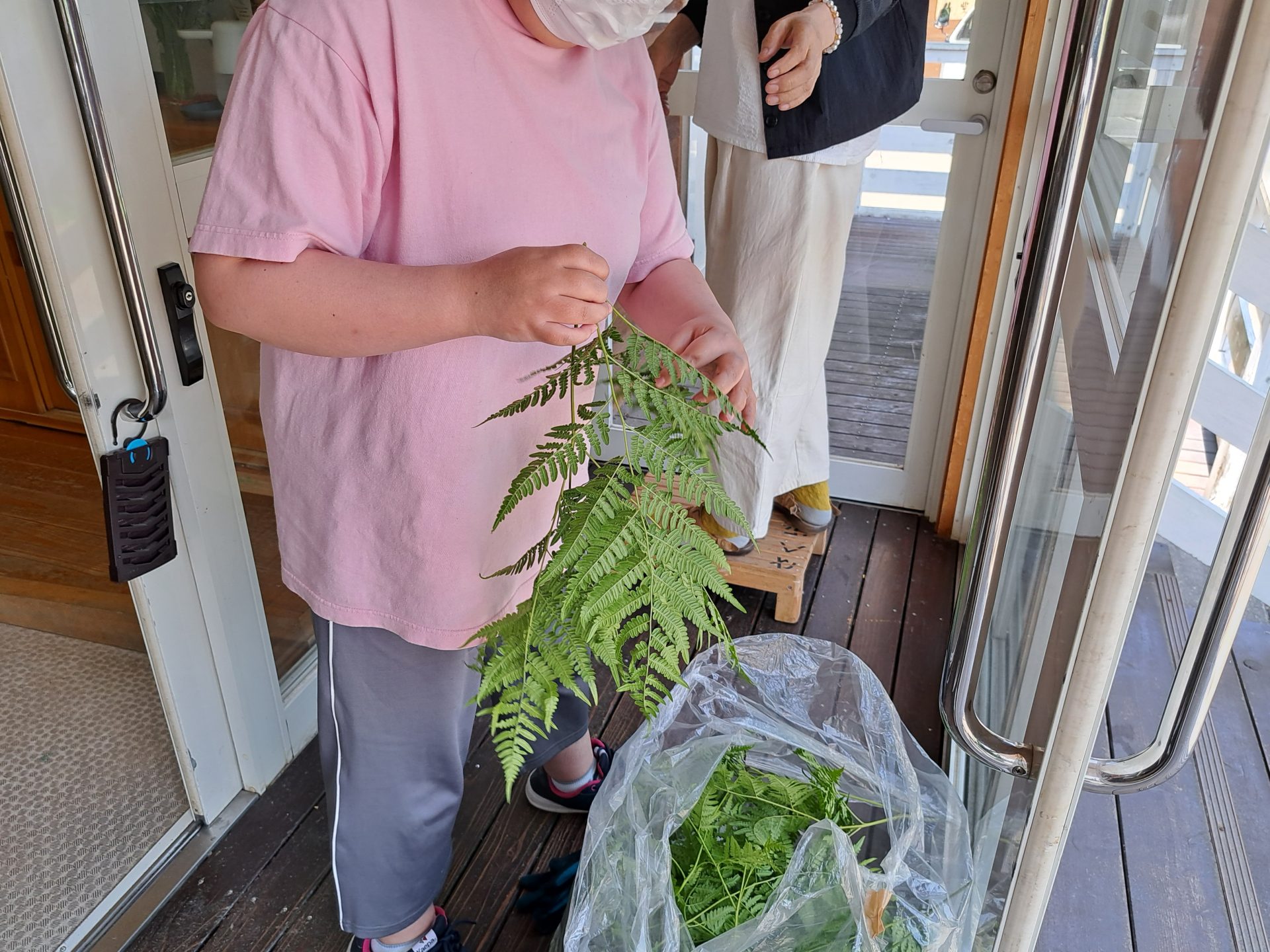 中に戻ろうとしたら、加工班のメンバーが何やらワラビの葉っぱを採取してきたようです~