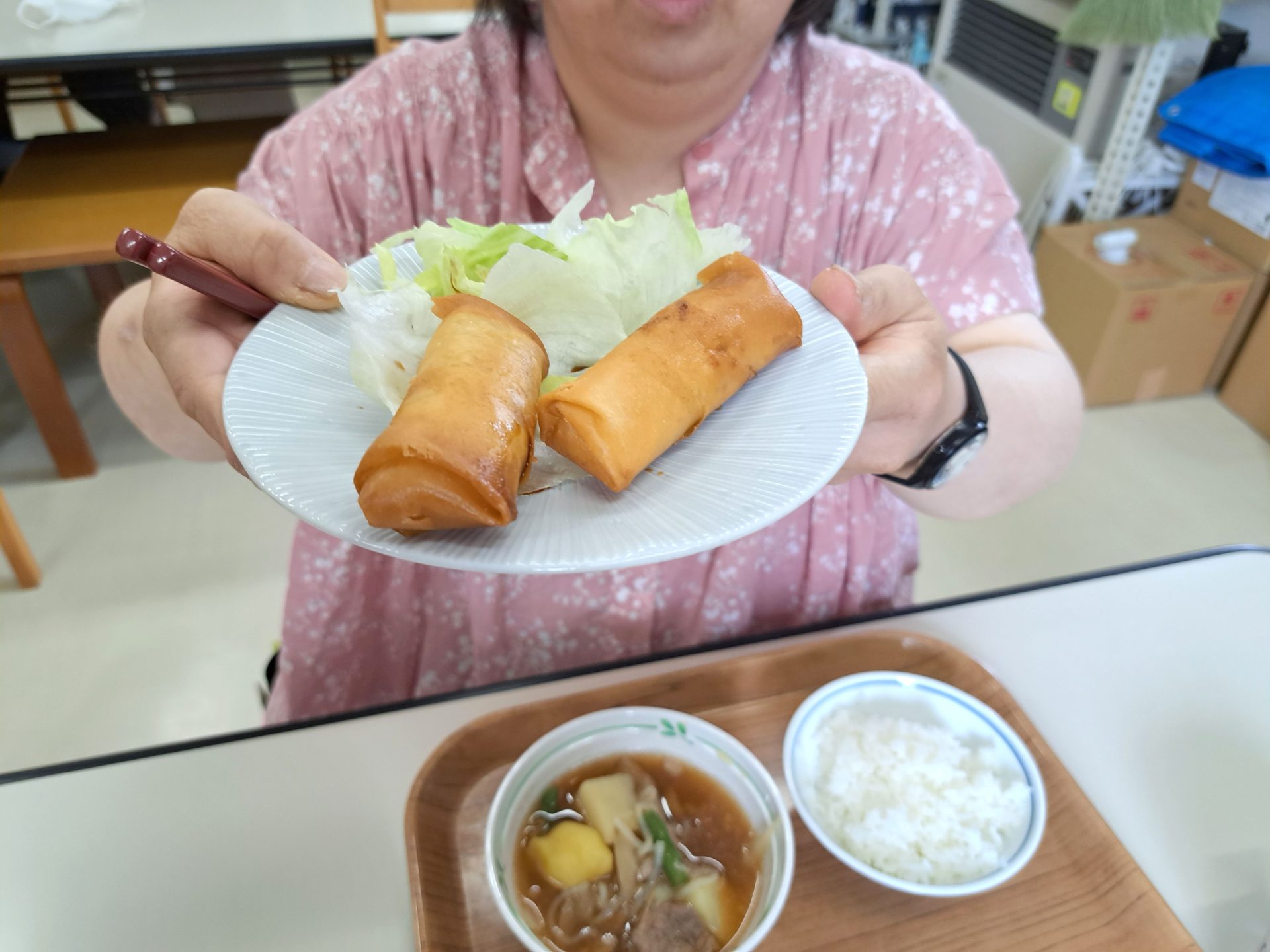 今日は凄いご飯の盛り~揚げ立て春巻き&肉じゃがですよ~(´▽`*)