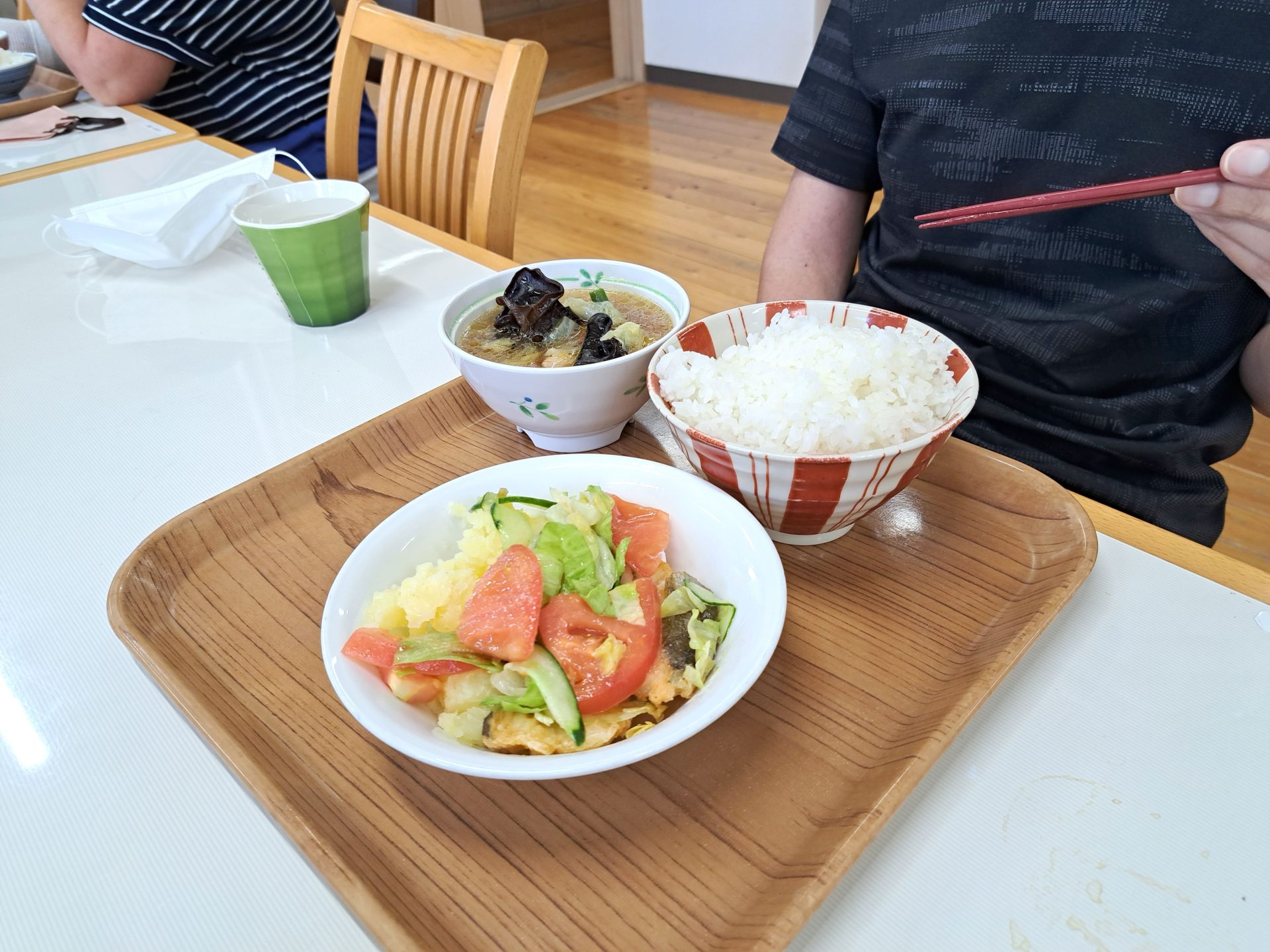 うちはの~ご飯、野菜炒め、ナスたっぷりみそ汁、野菜サラダにチーズと大葉のかまぼことウインナーのってて~朝から腹いっぱいだ!!