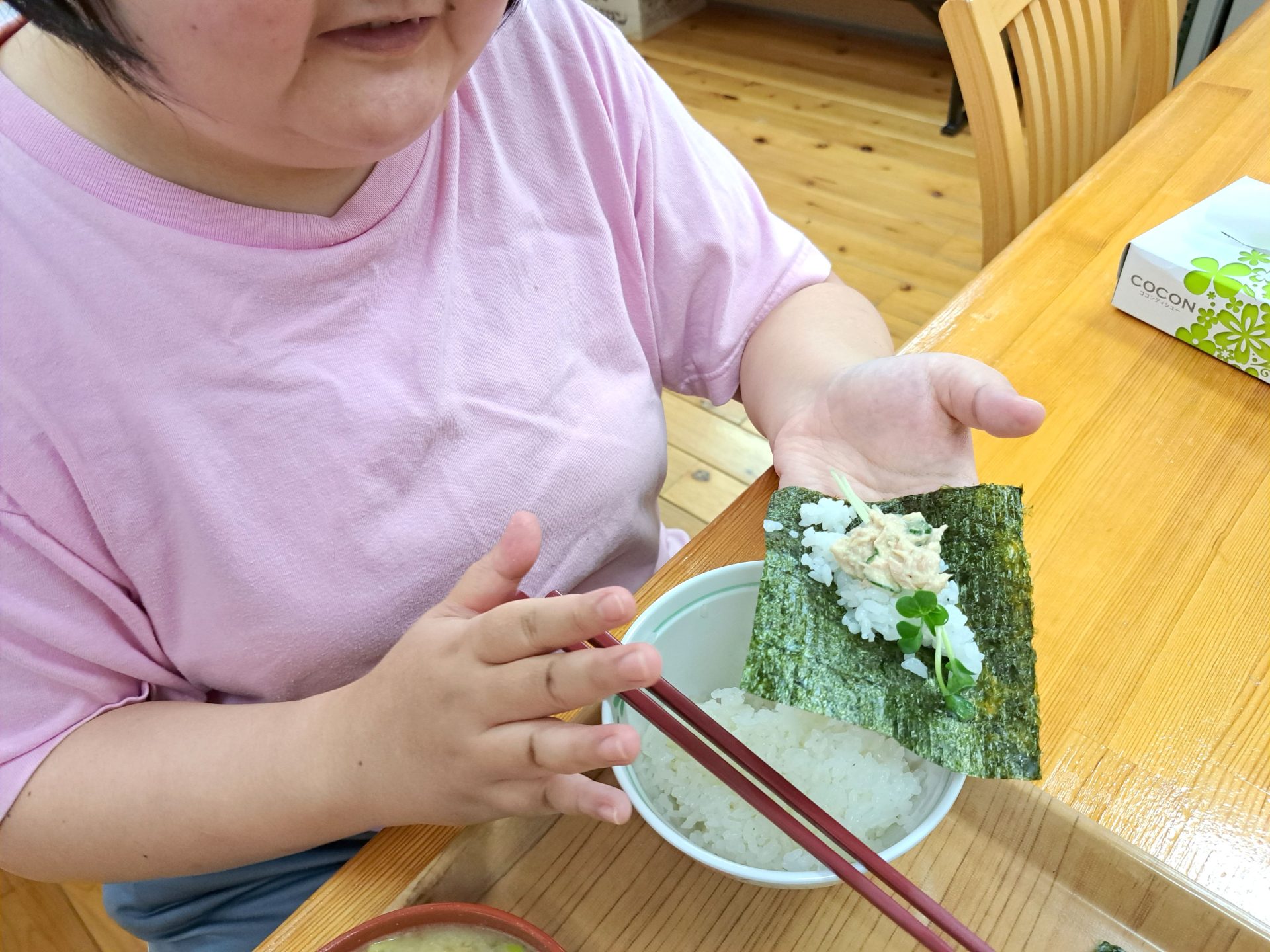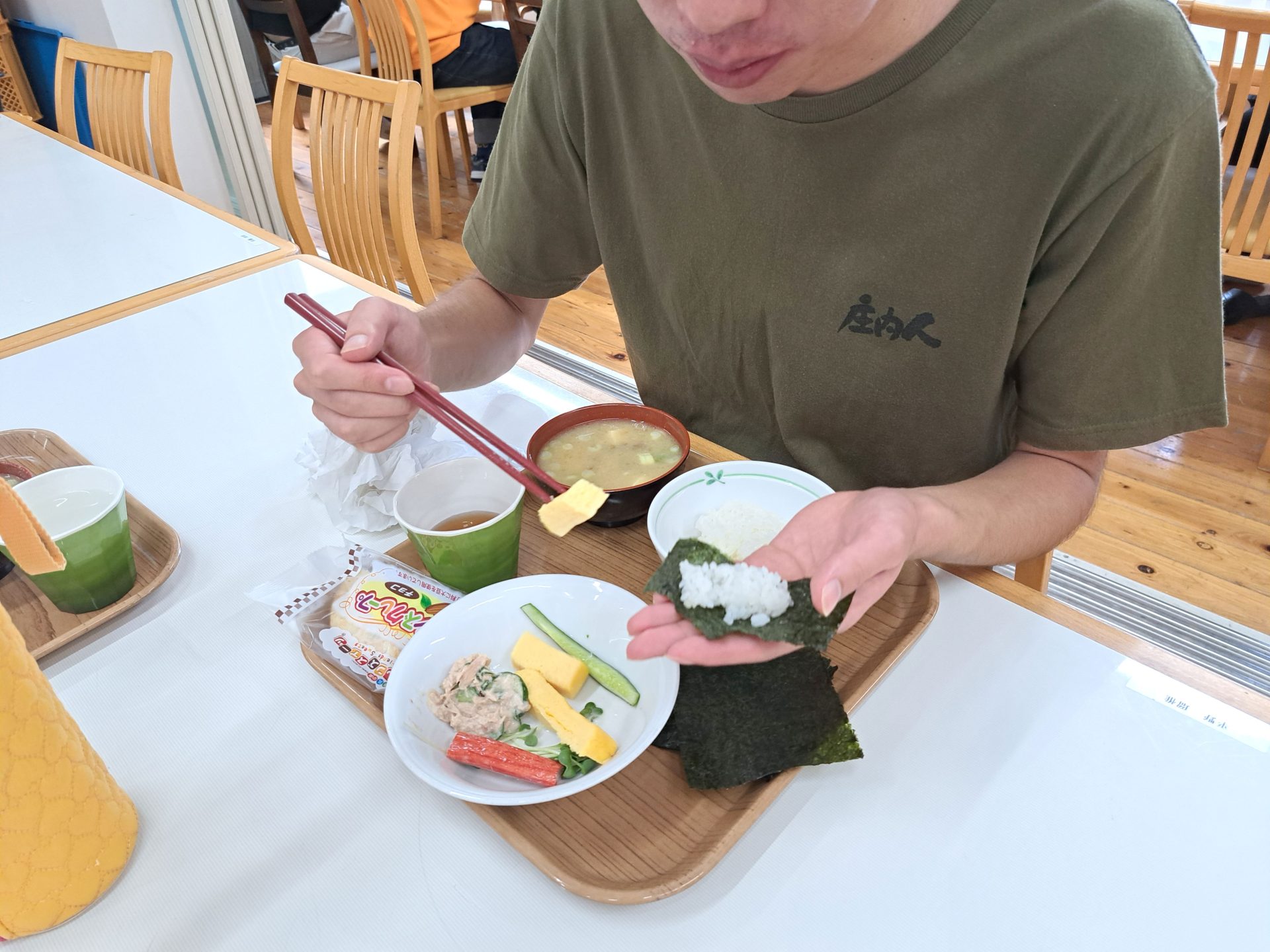 今日もシャンプー詰めがんばってますね!朝は?「自分で握ったおにぎりだ!」