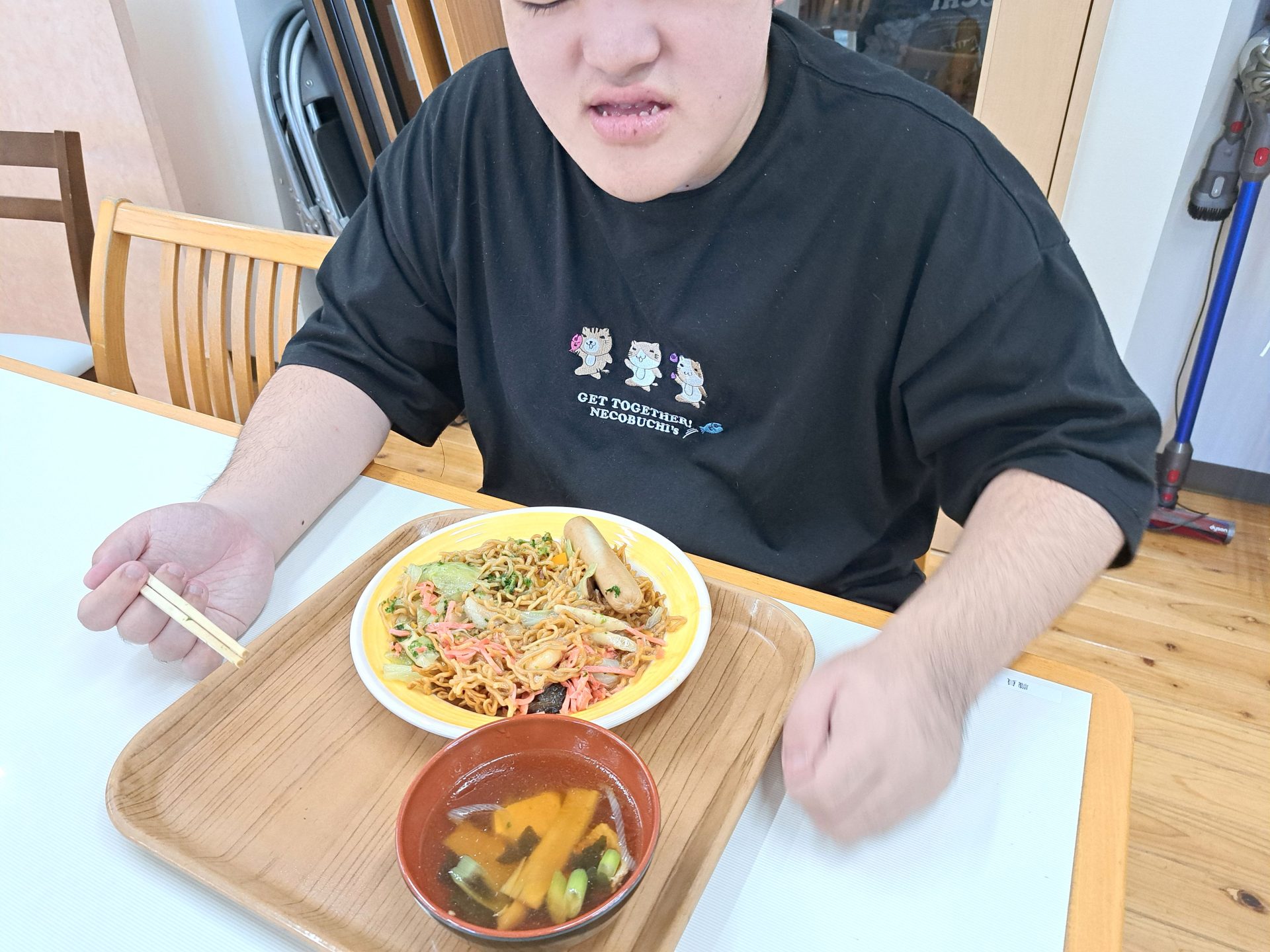 「さあ、今日は揚げ焼きそばですよ~♪」