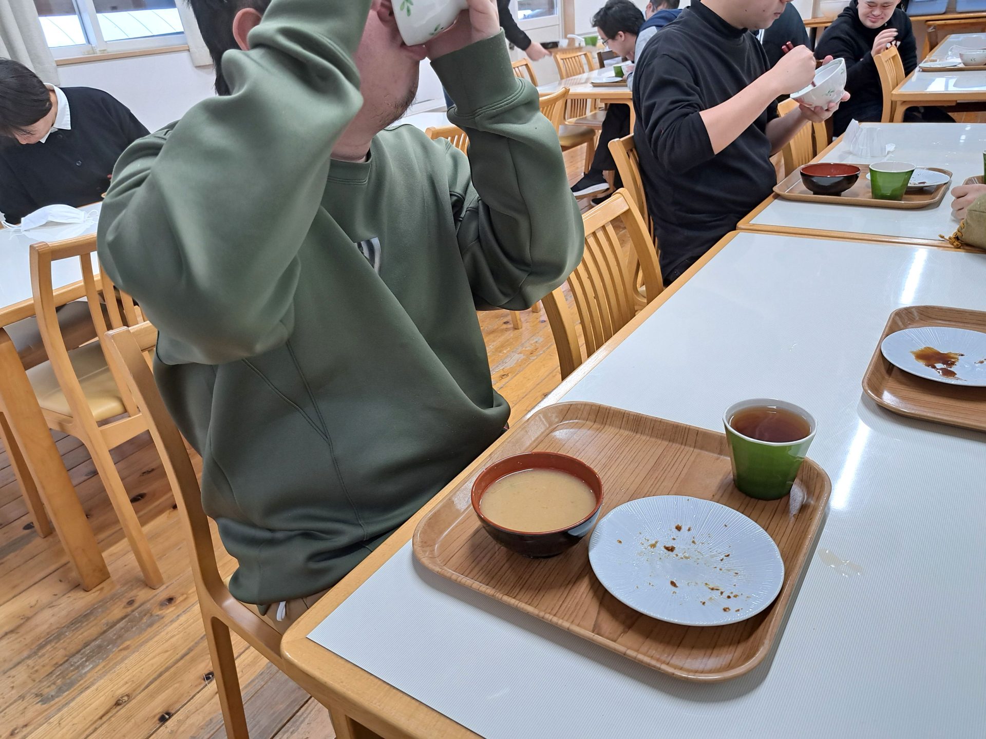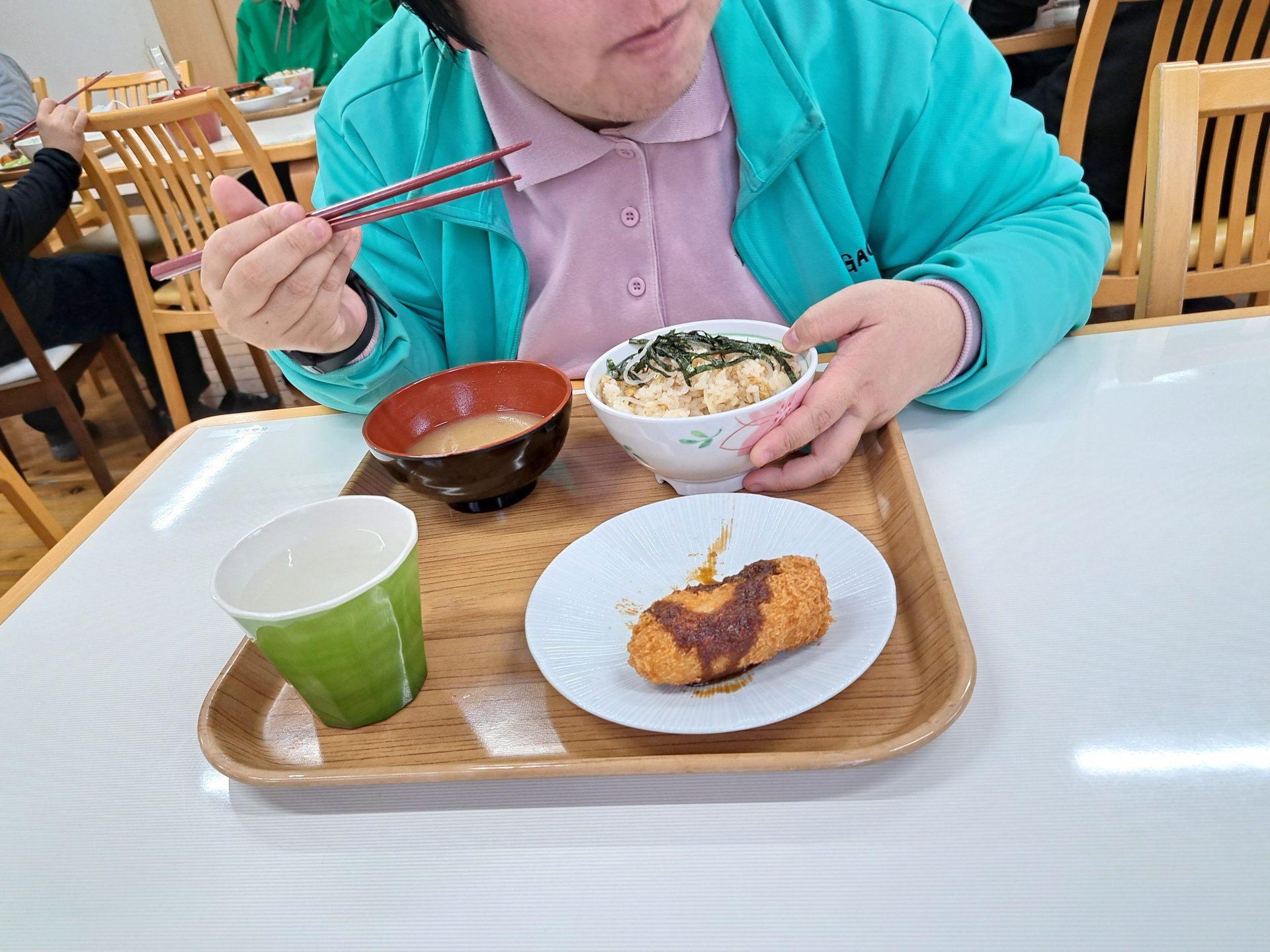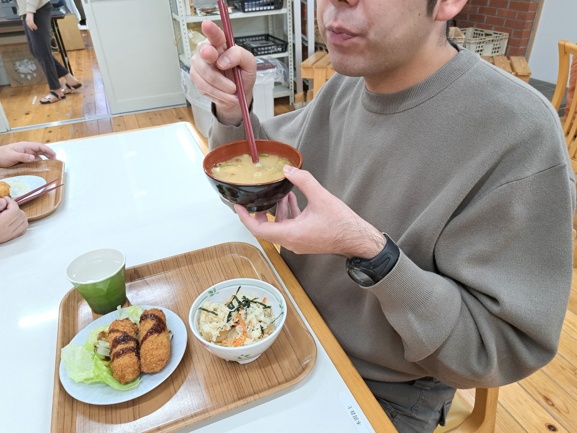 こちらが今日のメニュー!なめこ汁と五目御飯最高!揚げ立てのロールフライも♡