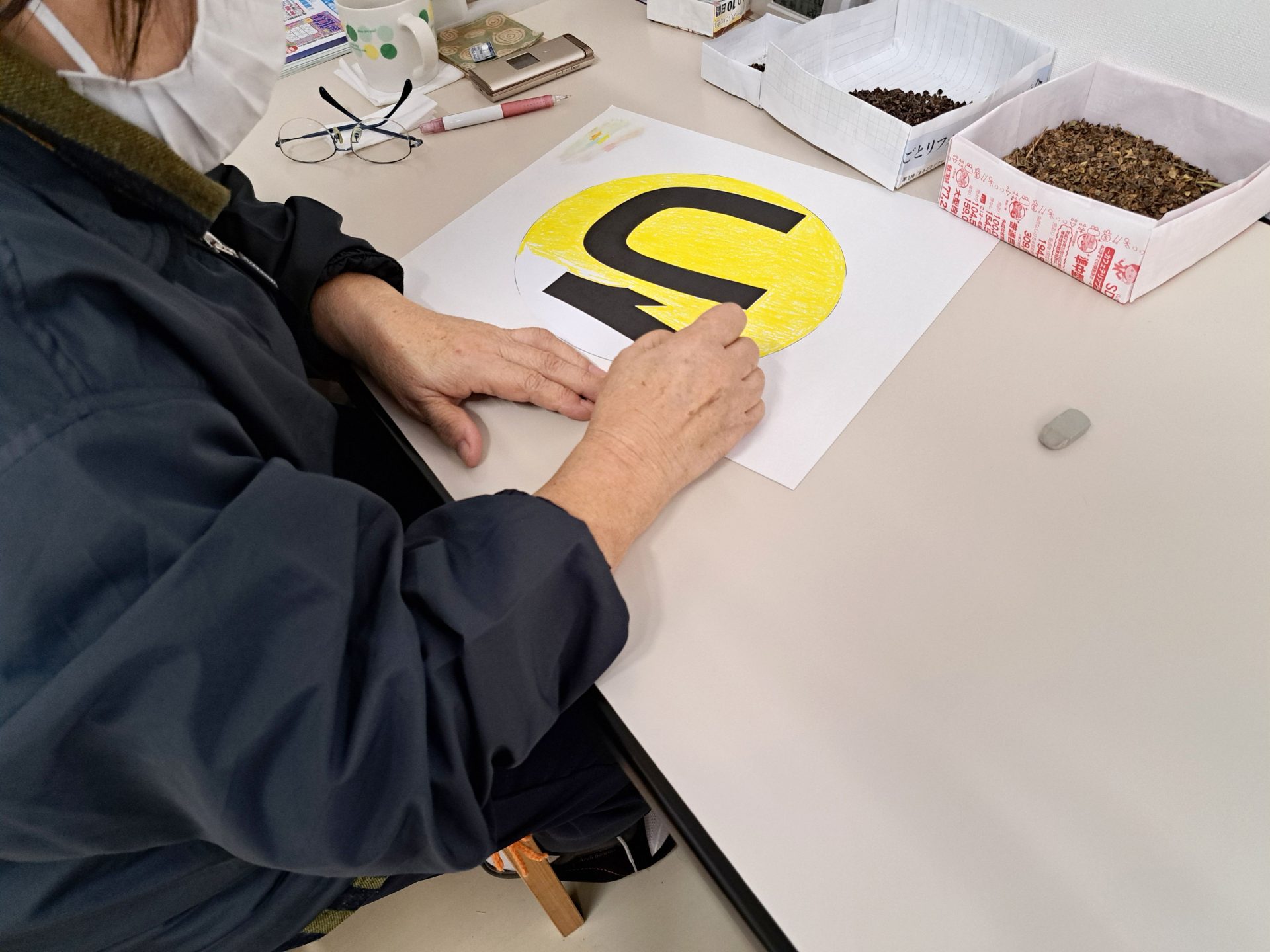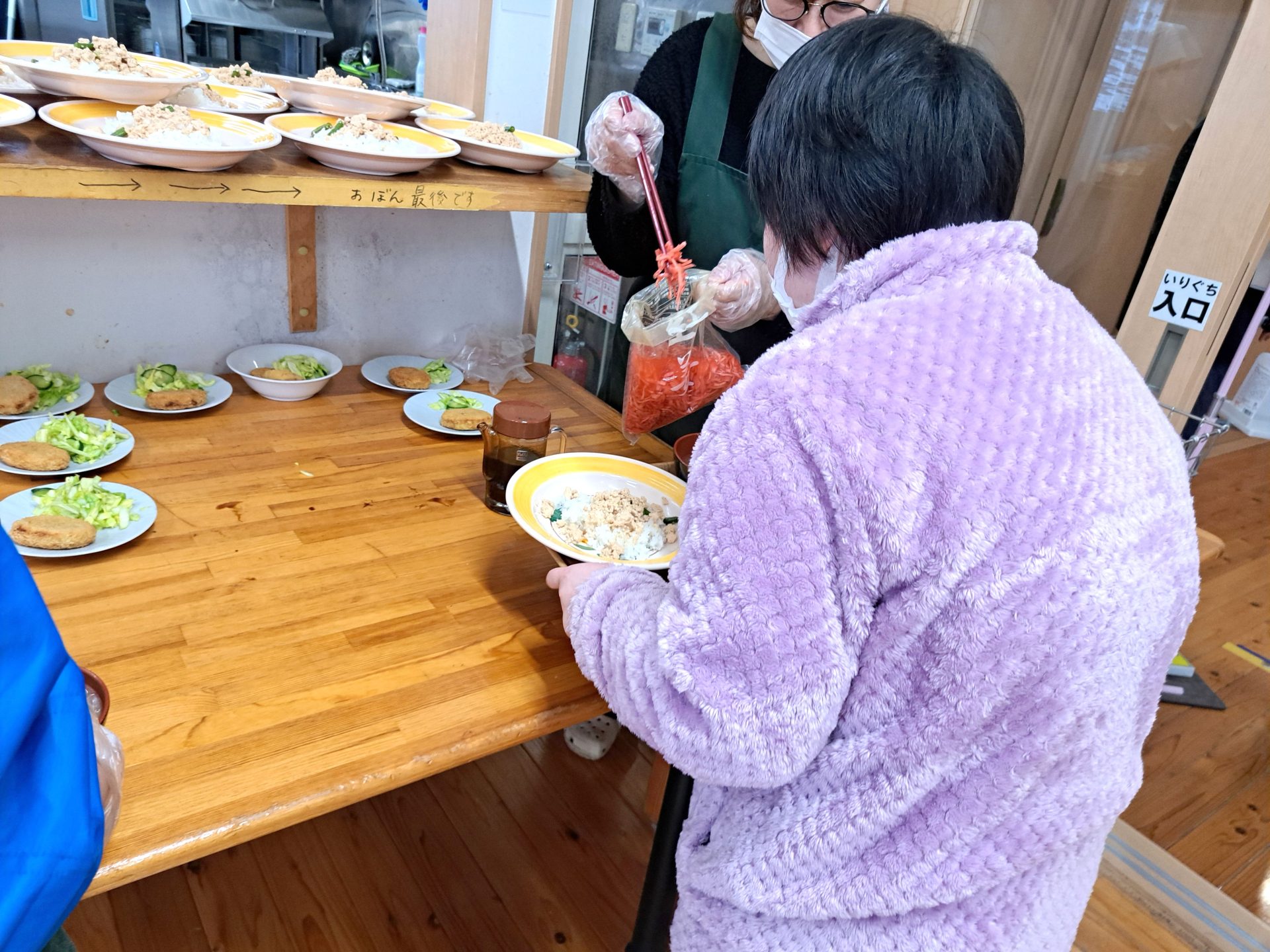 今日は空き缶の日で、回収から担当が戻るまでは食堂ホールでお仕事してます~