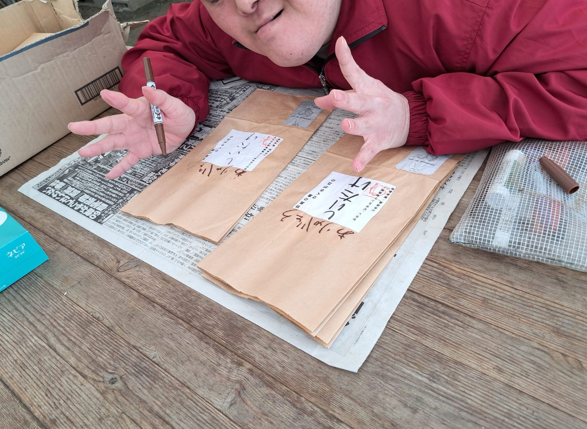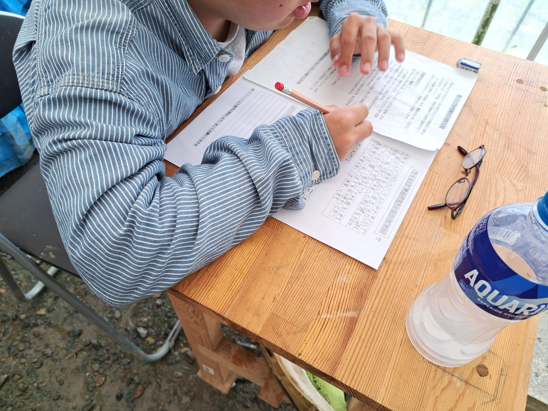 この日はハウスの近くで工事がありまして、騒音に配慮して農芸班は机を外に持ち出してお仕事でした~(´▽`*)