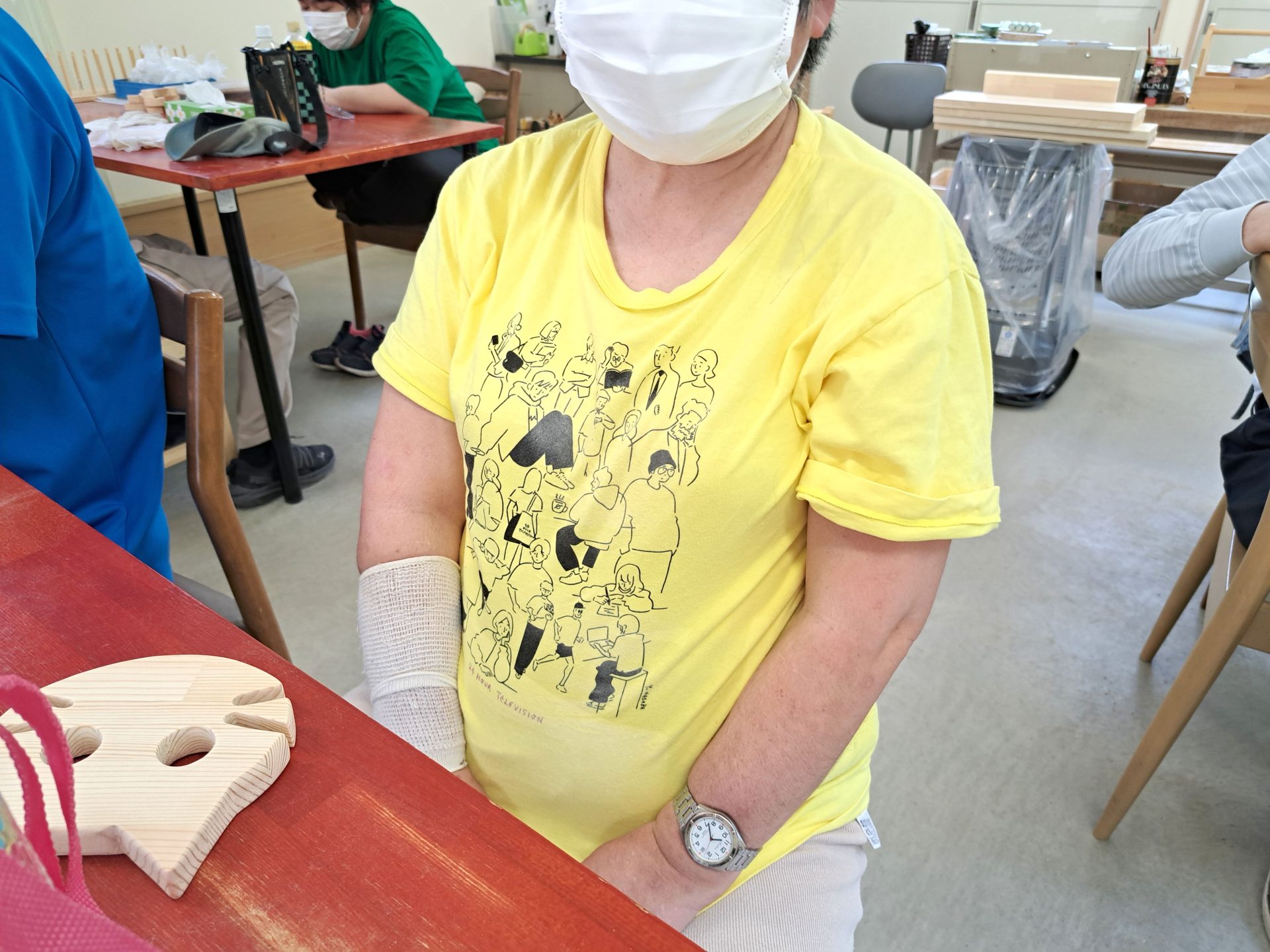 木工棟に向かう途中に見覚えのあるTシャツの利用者さん発見!