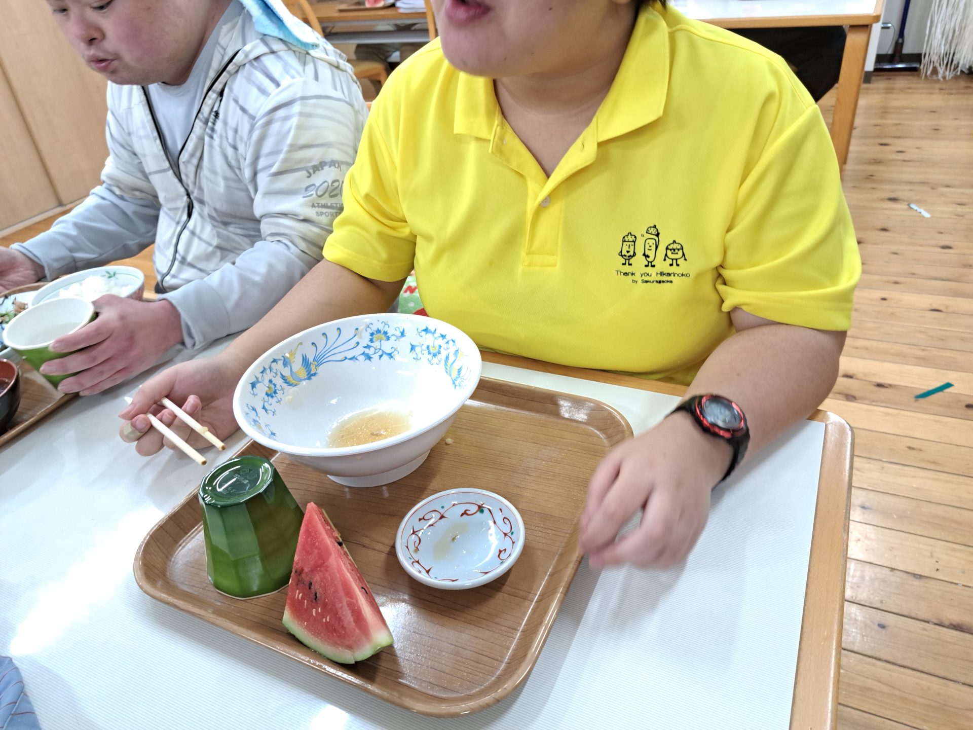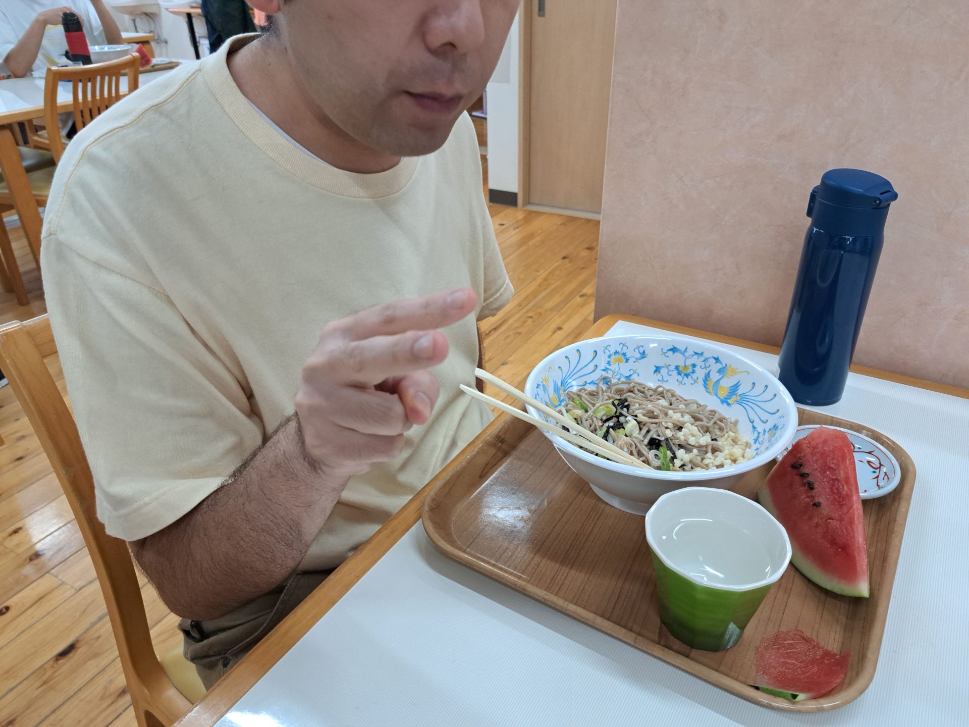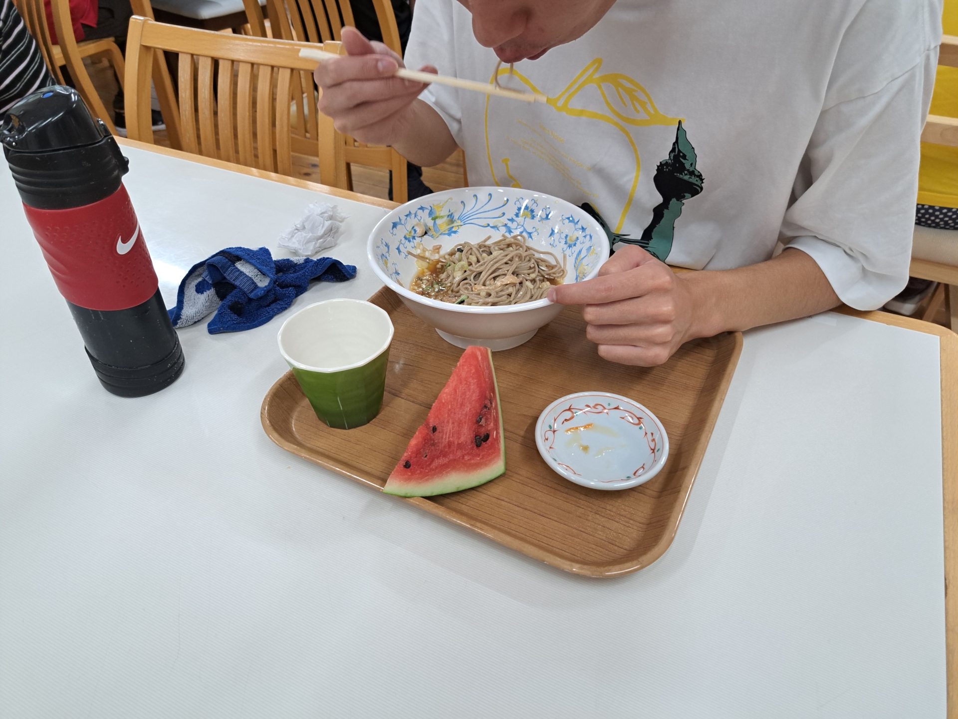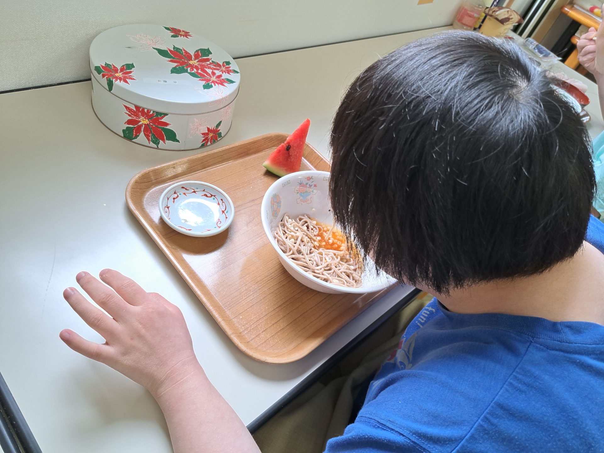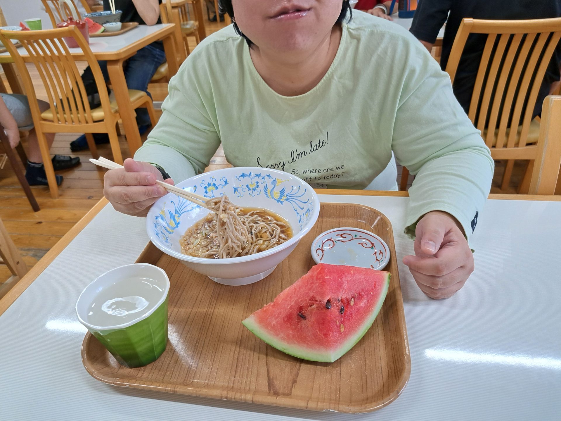 給食できましたよ~硬派冷たい肉そばとスイカですよ~( *´艸`)