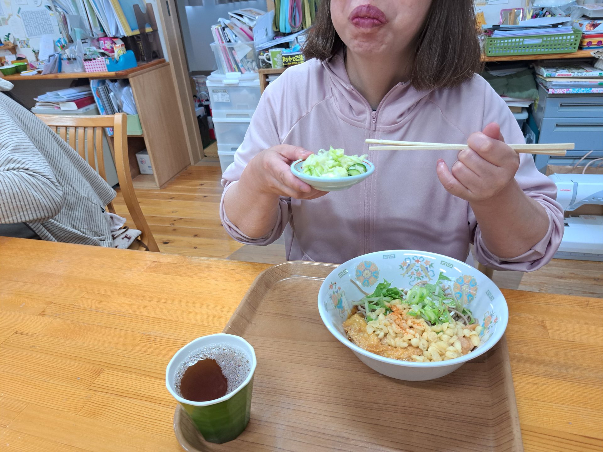 - 「焼きそばカリカリ楽しみ~♪からあげないかな?」
