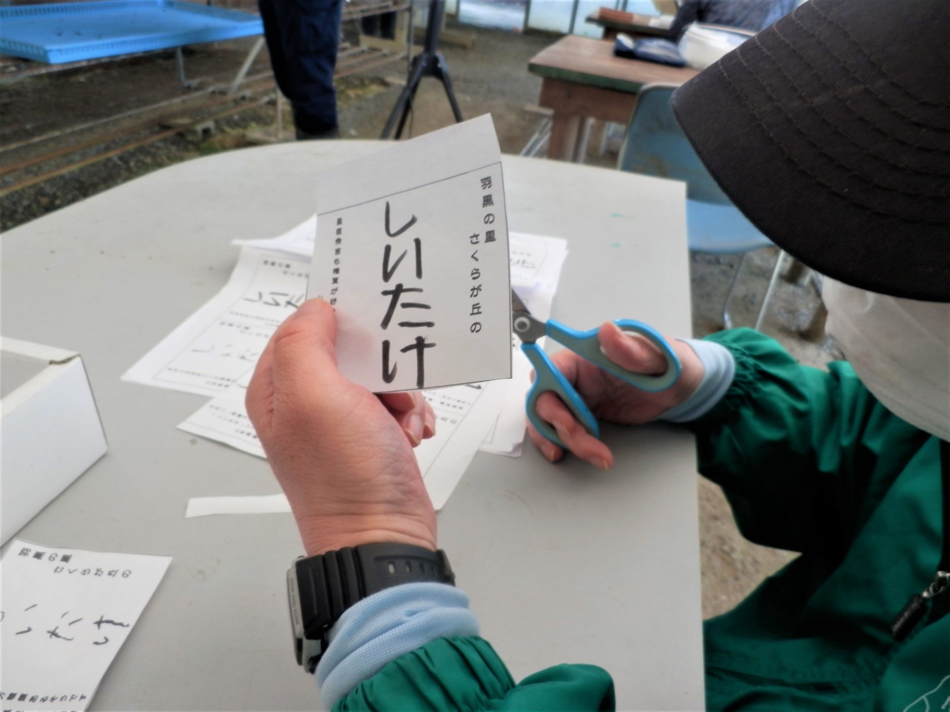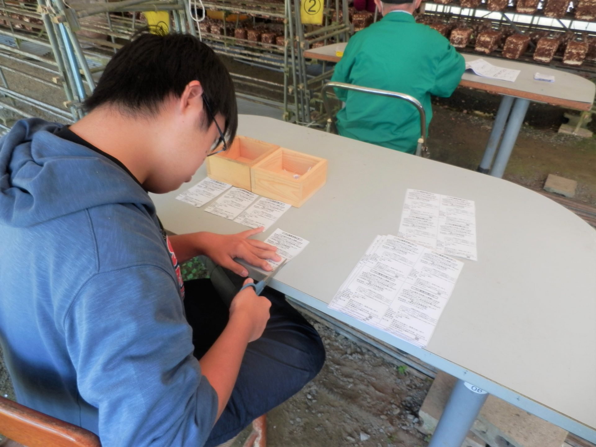 新しい菌床を袋から出す作業をしている利用者さん↓