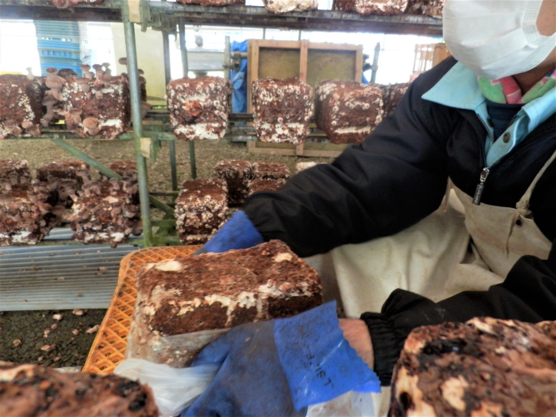 - 棚から袋入り菌床を取って