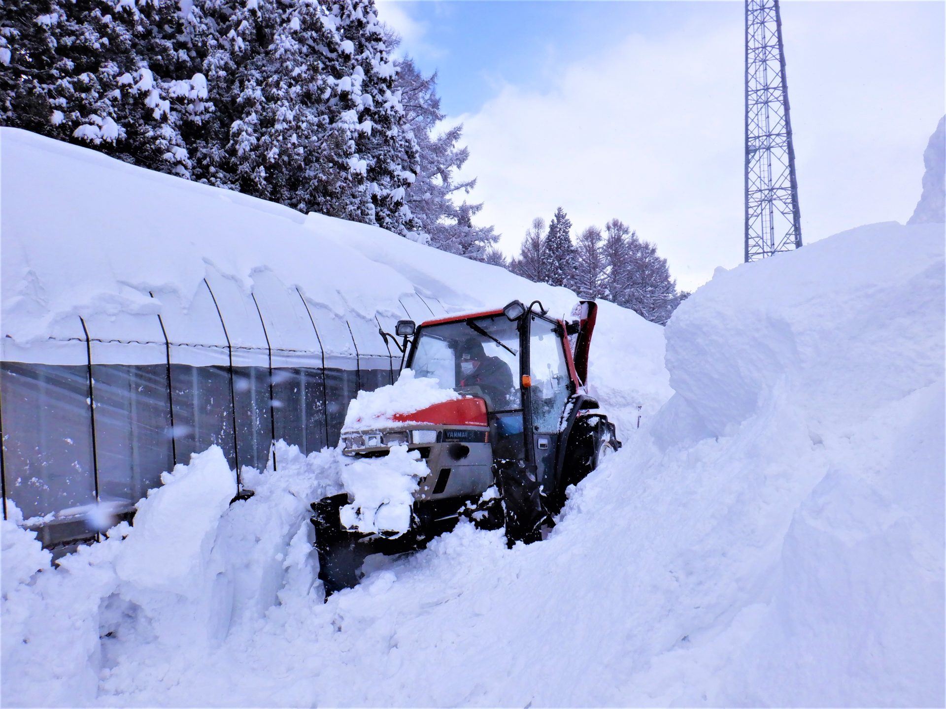 ハウス周りの除雪は危険と隣り合わせ~(@_@)埋もれて出れなくなったこともあるそうな…でもその経験を繰り返して上手になるんだそうです~