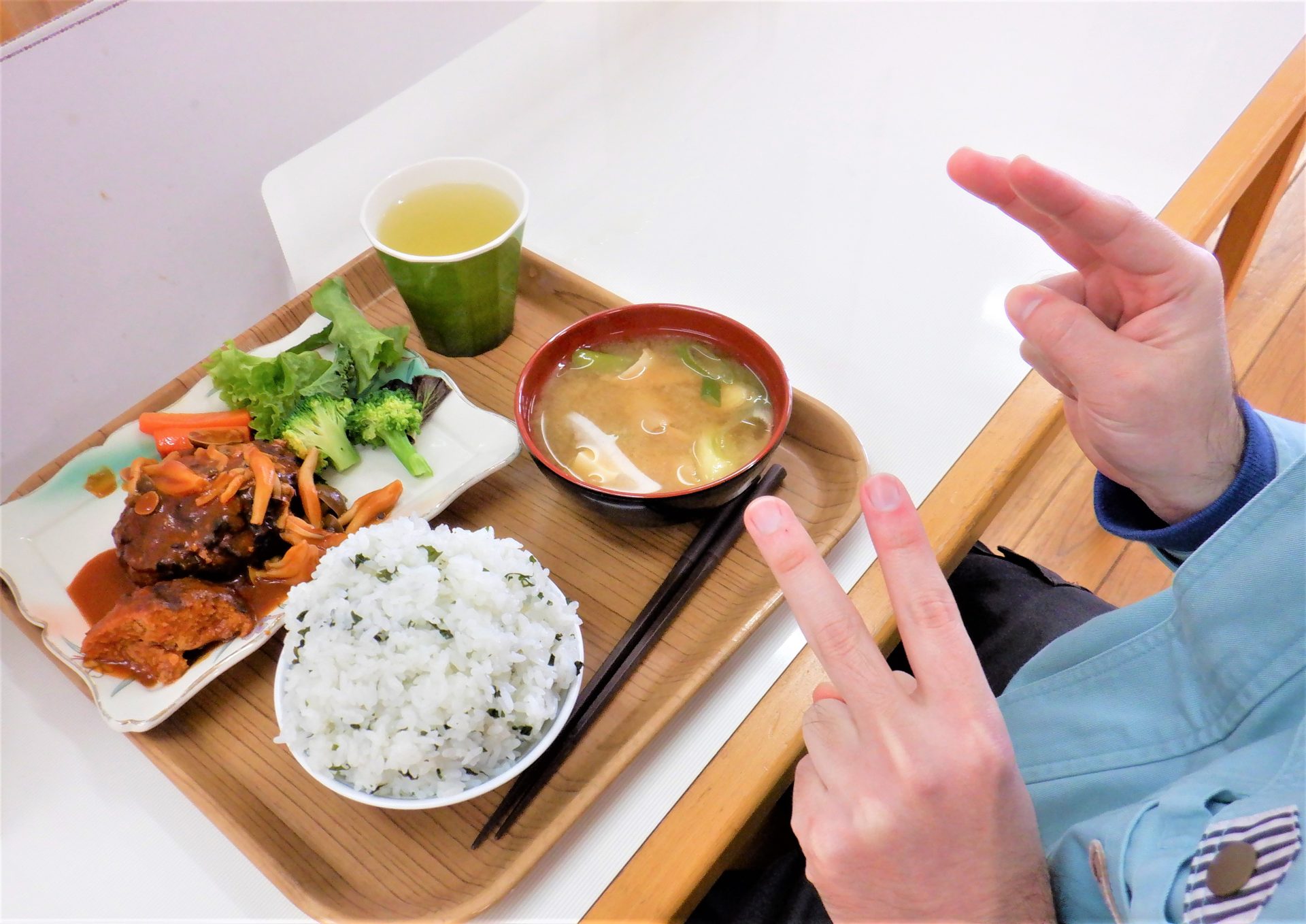 - 「おにぎりとキノコのみそ汁で~す!」
