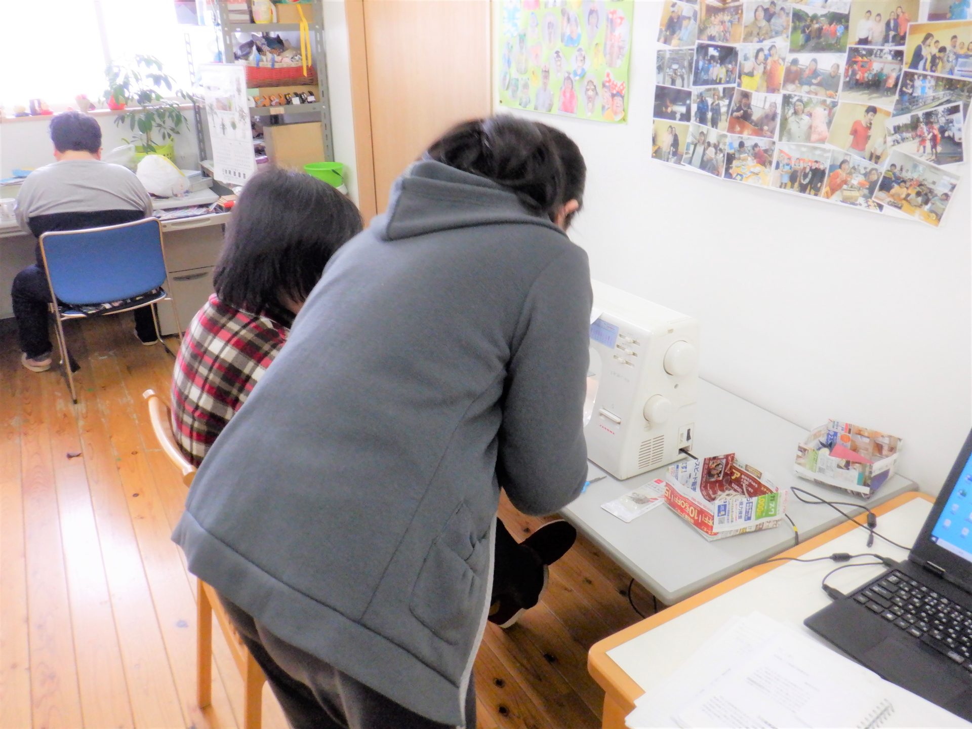 - 「最近ミシンを始めた利用者さんに優しく教えるミシンの先輩利用者さん(´▽`*)