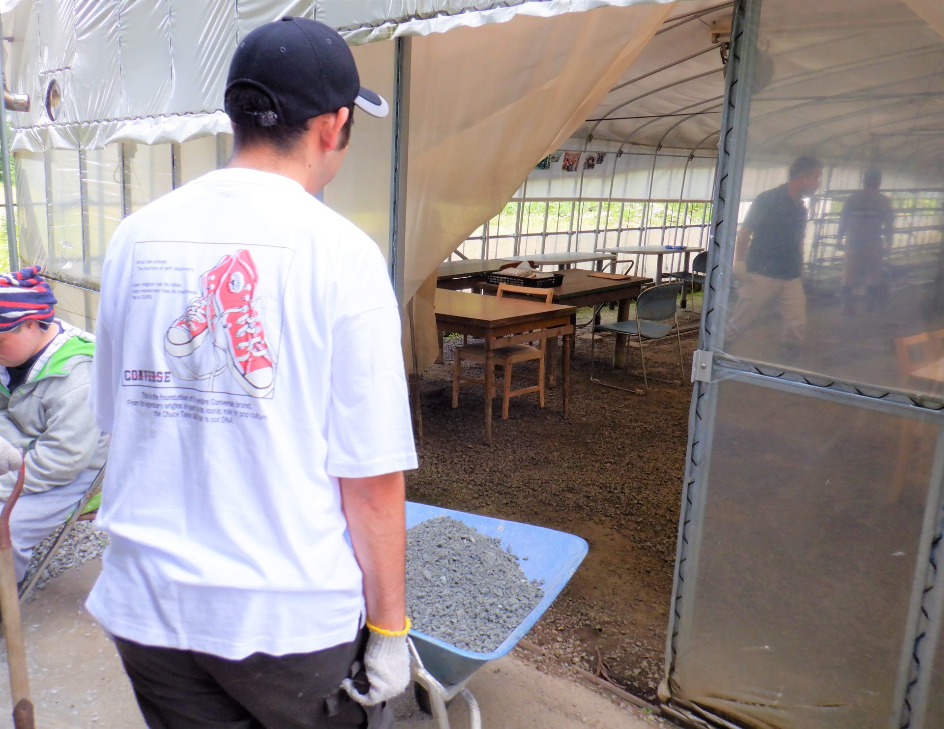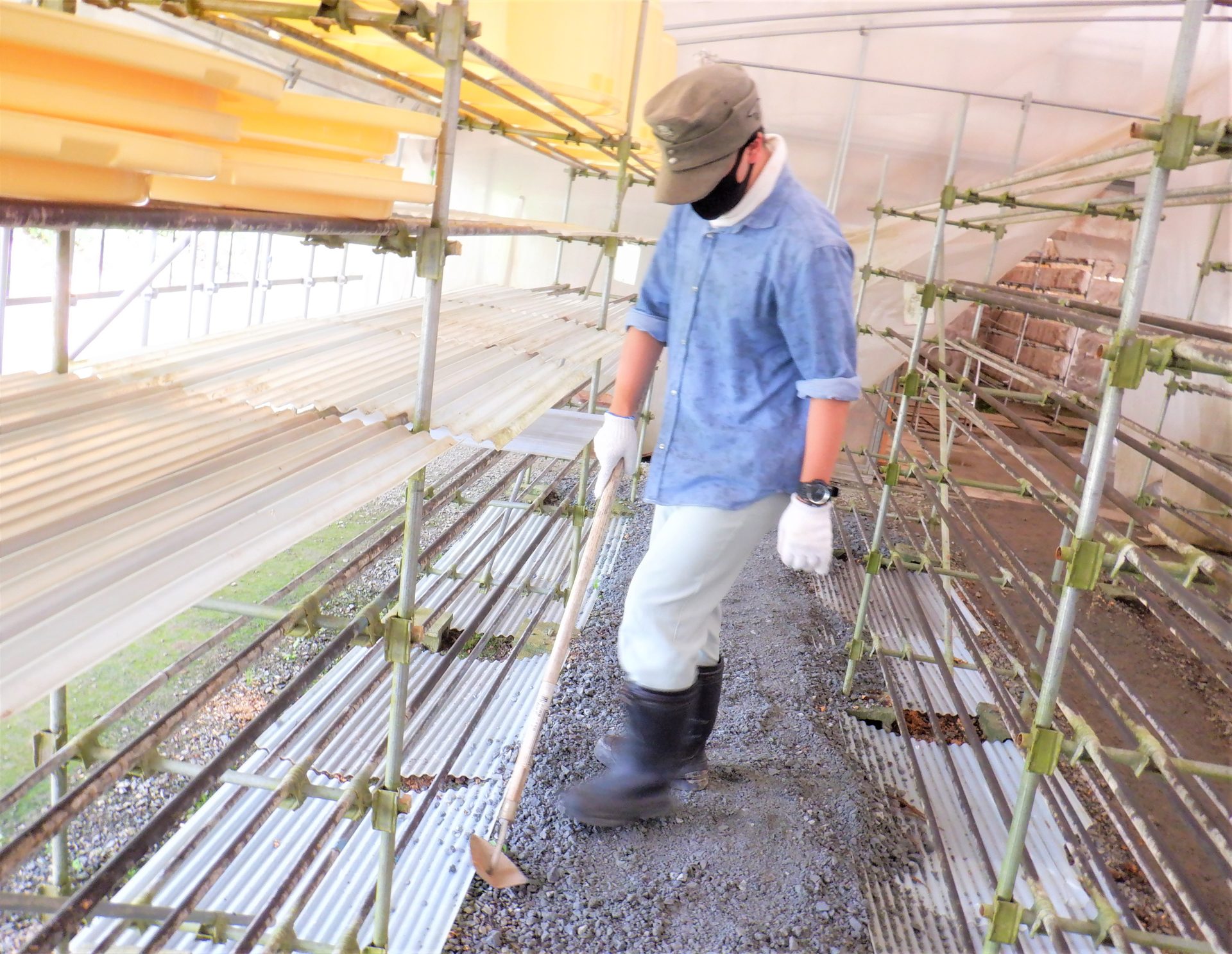 ハウスの道の凸凹を直すためにジャリを敷くんだよ!