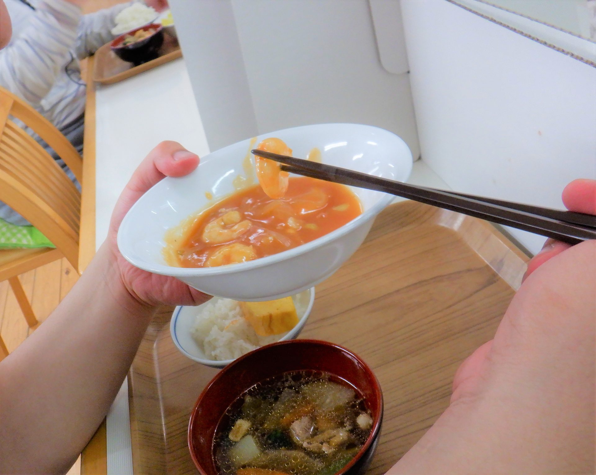 エビがいっぱい入ってる優しいお味のエビチリとふんわり蒸し玉子♪