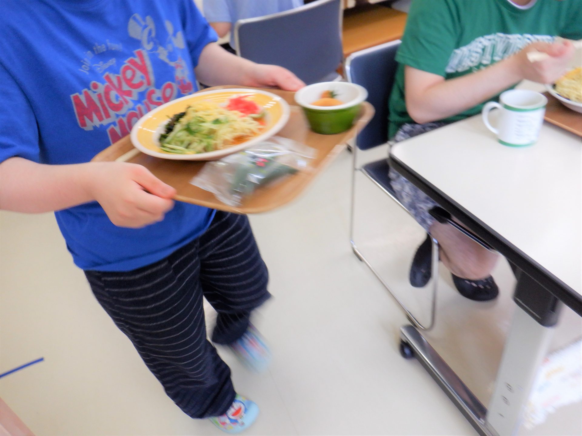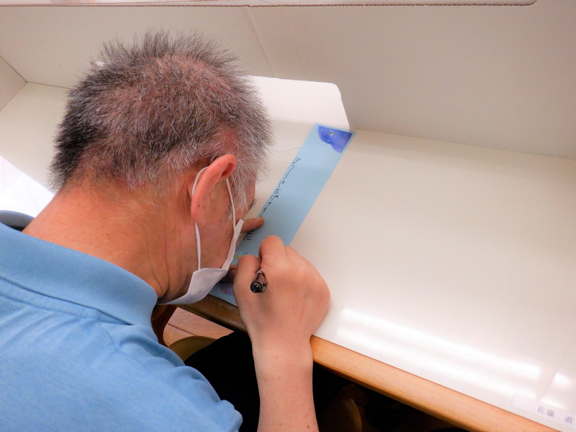 館内放送で七夕会の説明をしたら、すぐに短冊づくりに移ります~(´▽`*)