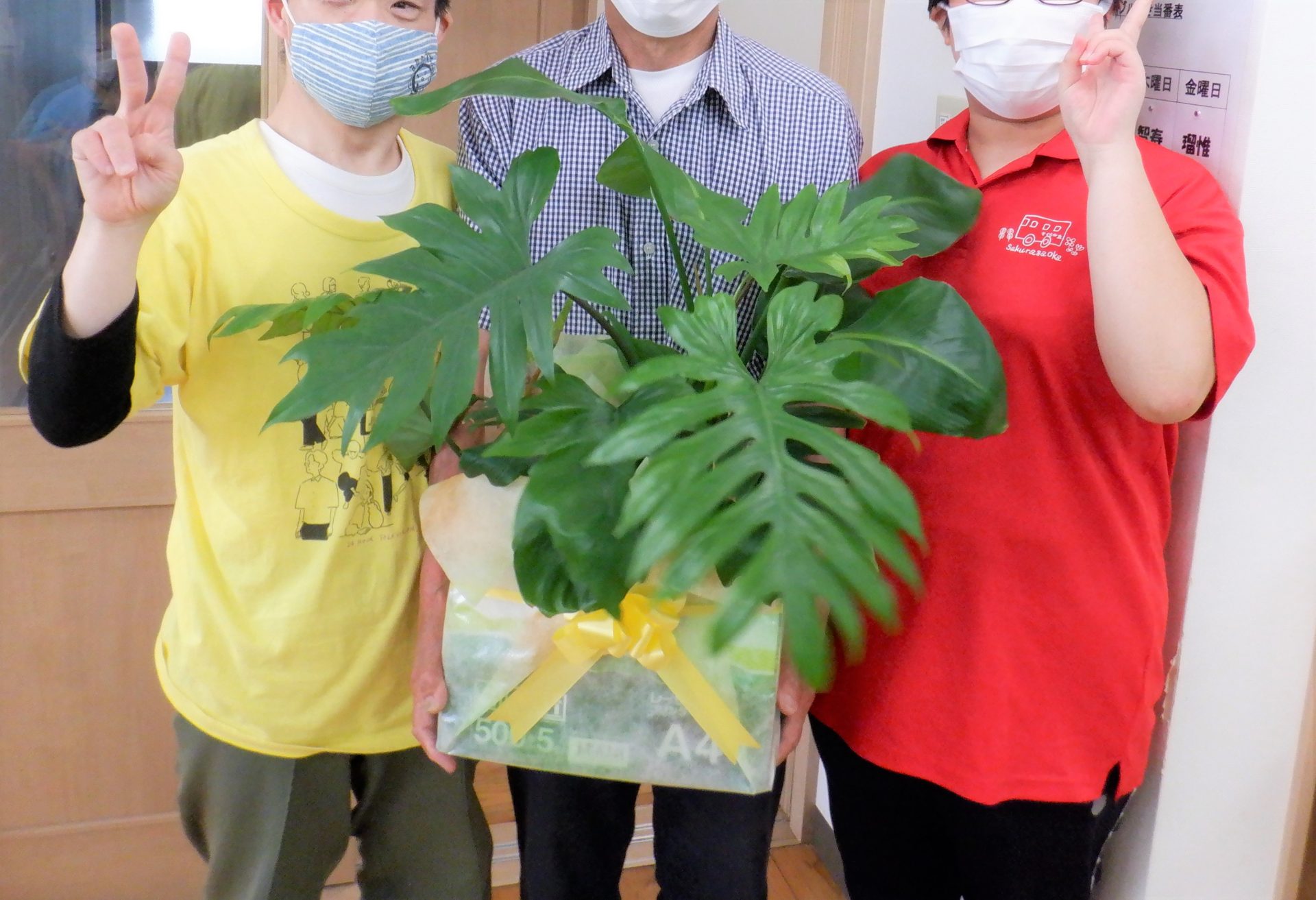 記念に観葉植物をプレゼント…ってあれ?葉っぱの陰で利用者さん泣いてる??