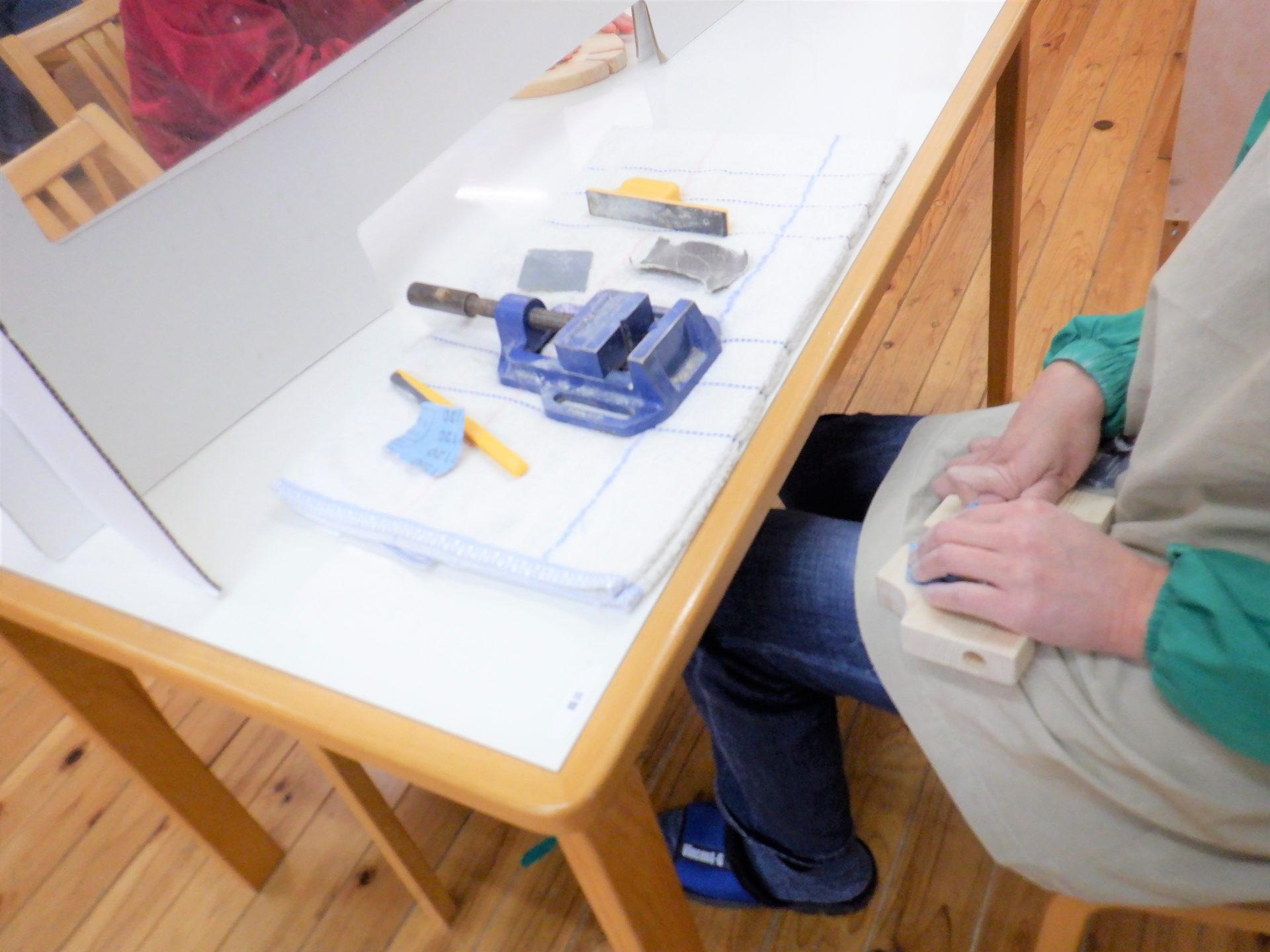 今日は(火)で空き缶回収の日だから、木工班は担当が戻るまで本館内で仕事。