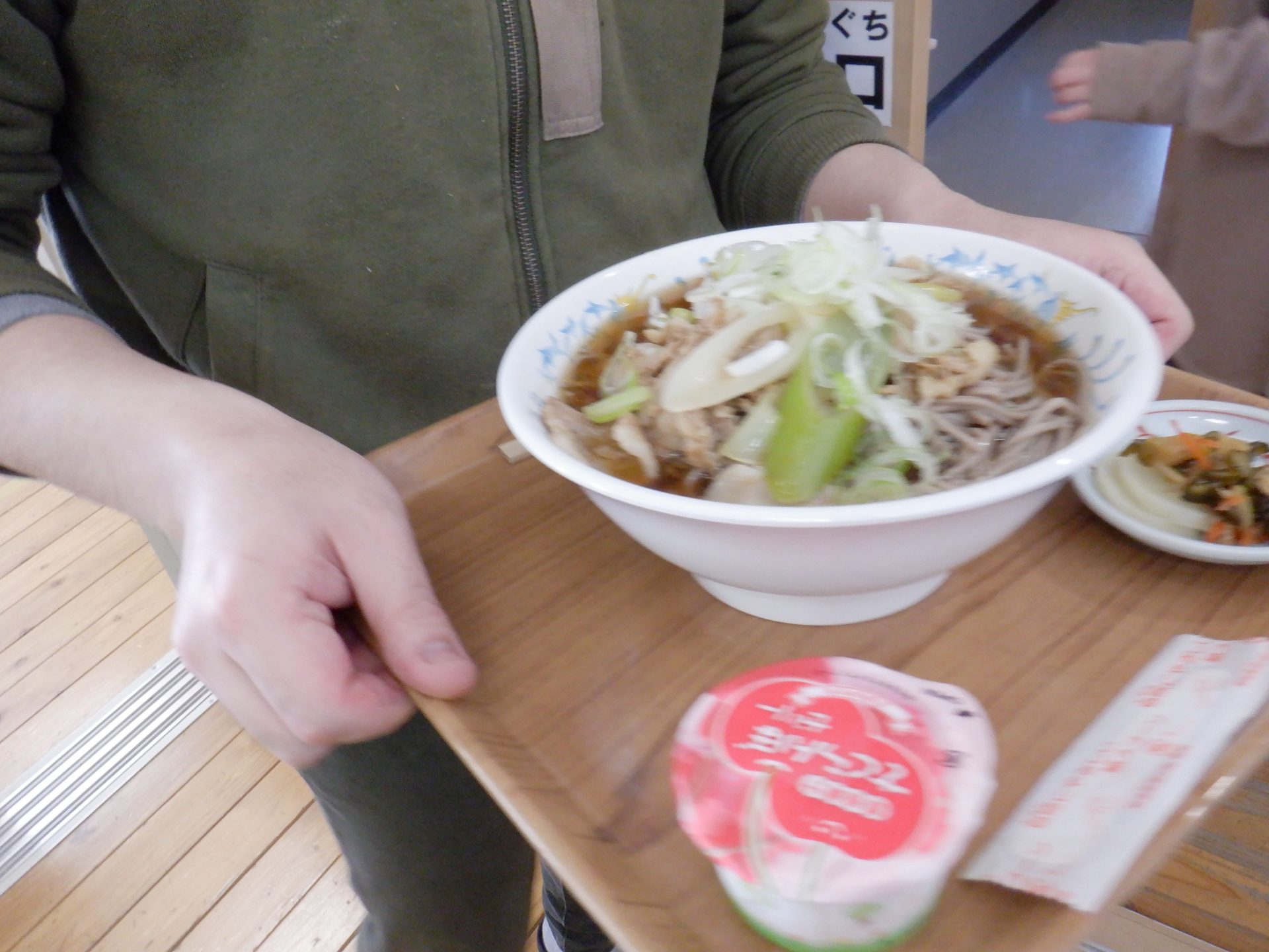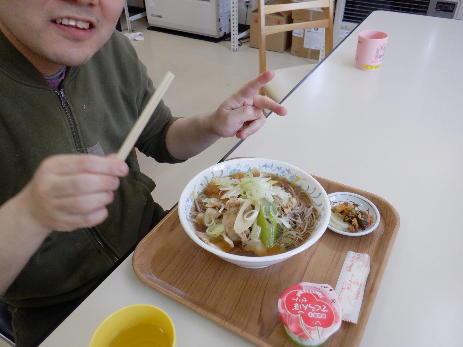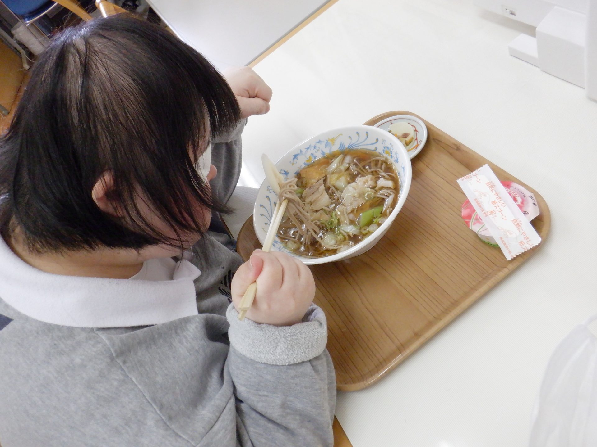 で、本日の給食は…ネギたっぷりの肉そば美味しそーーー(*^▽^*)