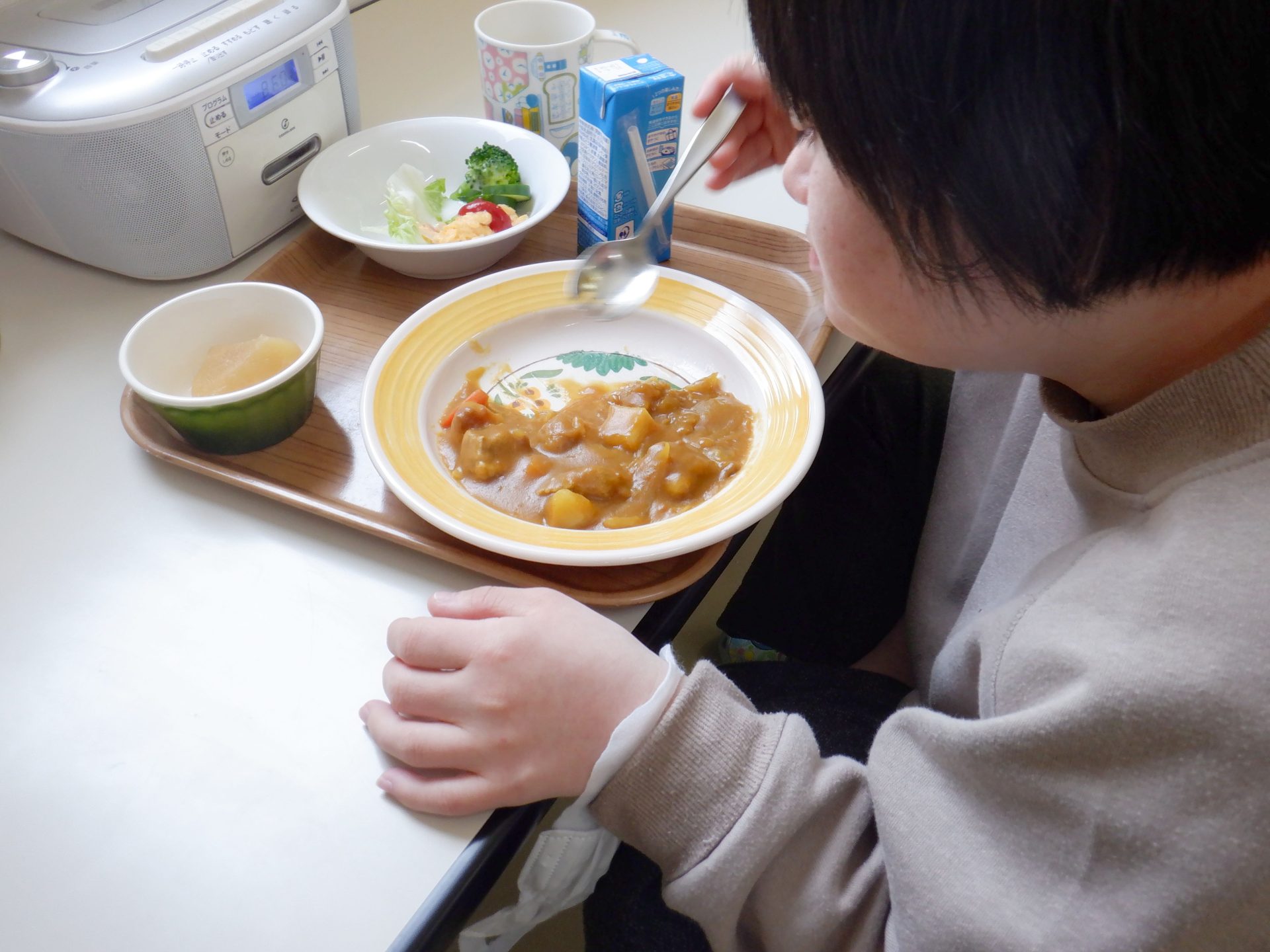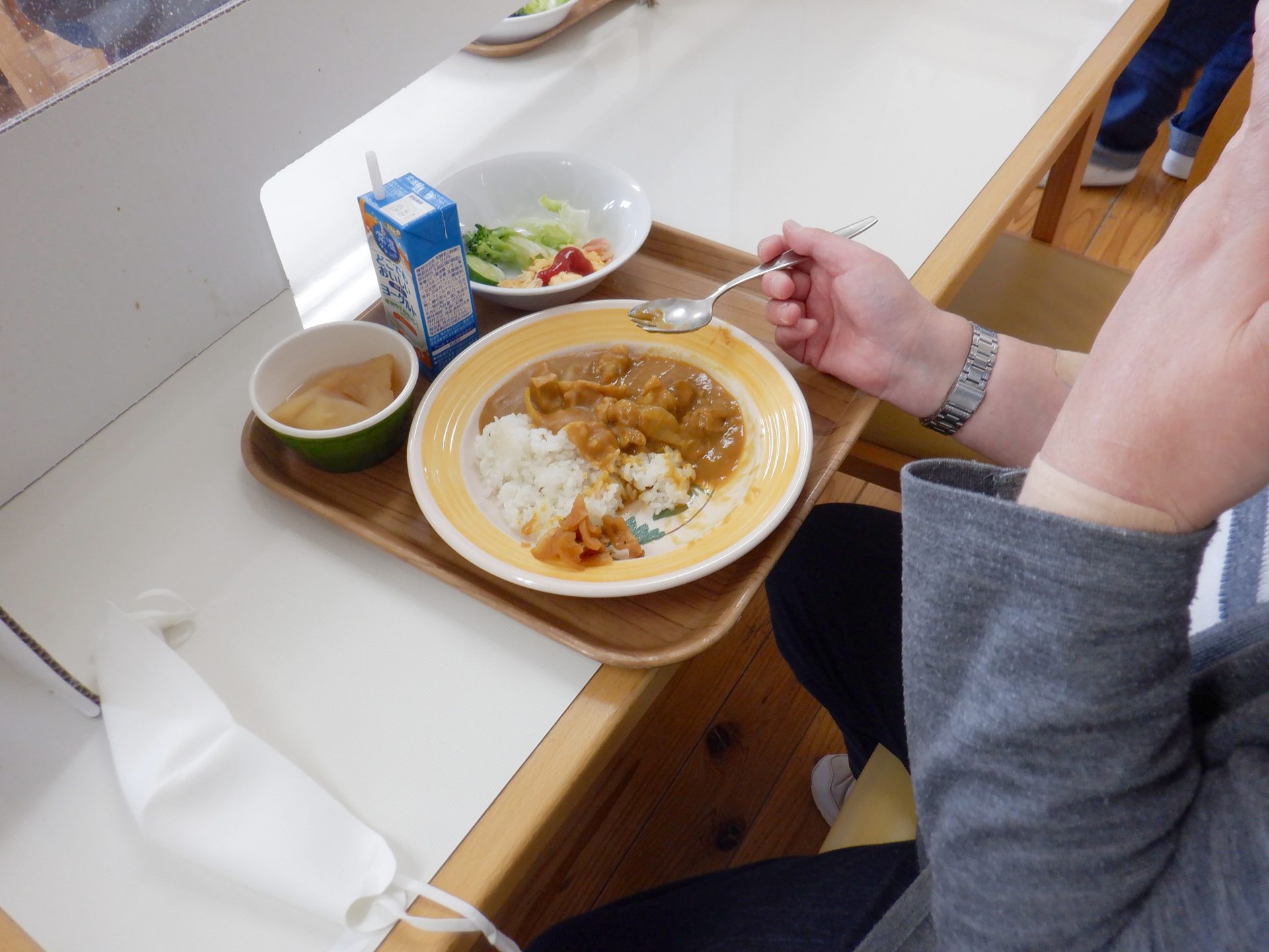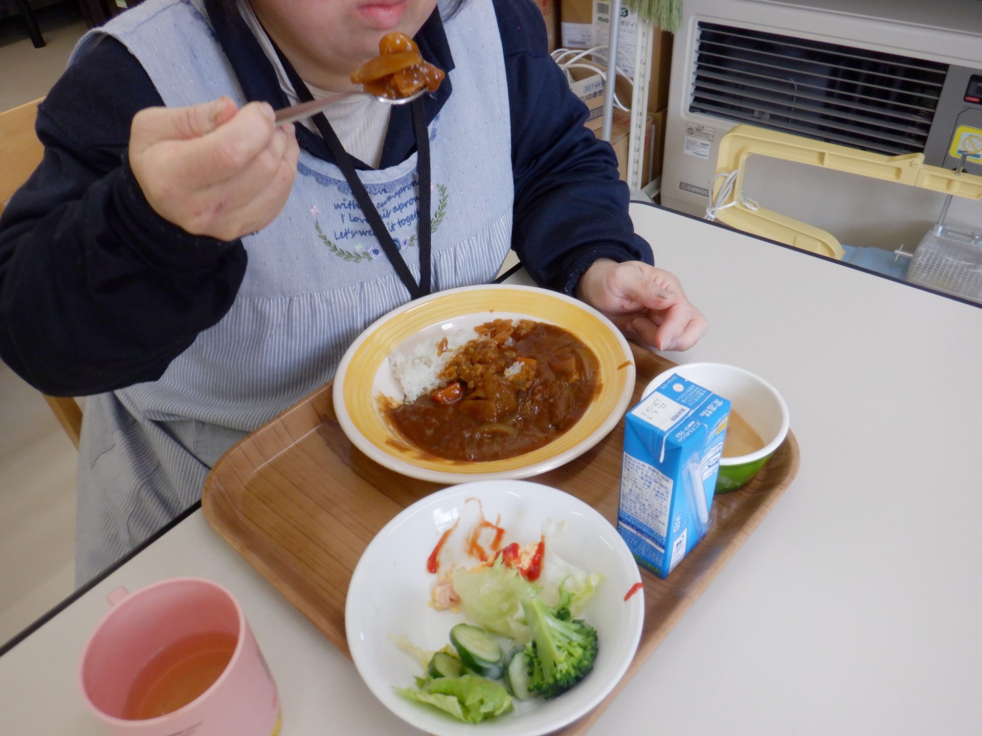 45人分のカレーを一気に大鍋で作るので、野菜やお肉の美味しい成分がたっぷりのせいか、家庭で作るカレーより美味しいんです!うちのカレーの数倍おいしいです~たくさん食べちゃうんです~(´▽`*)