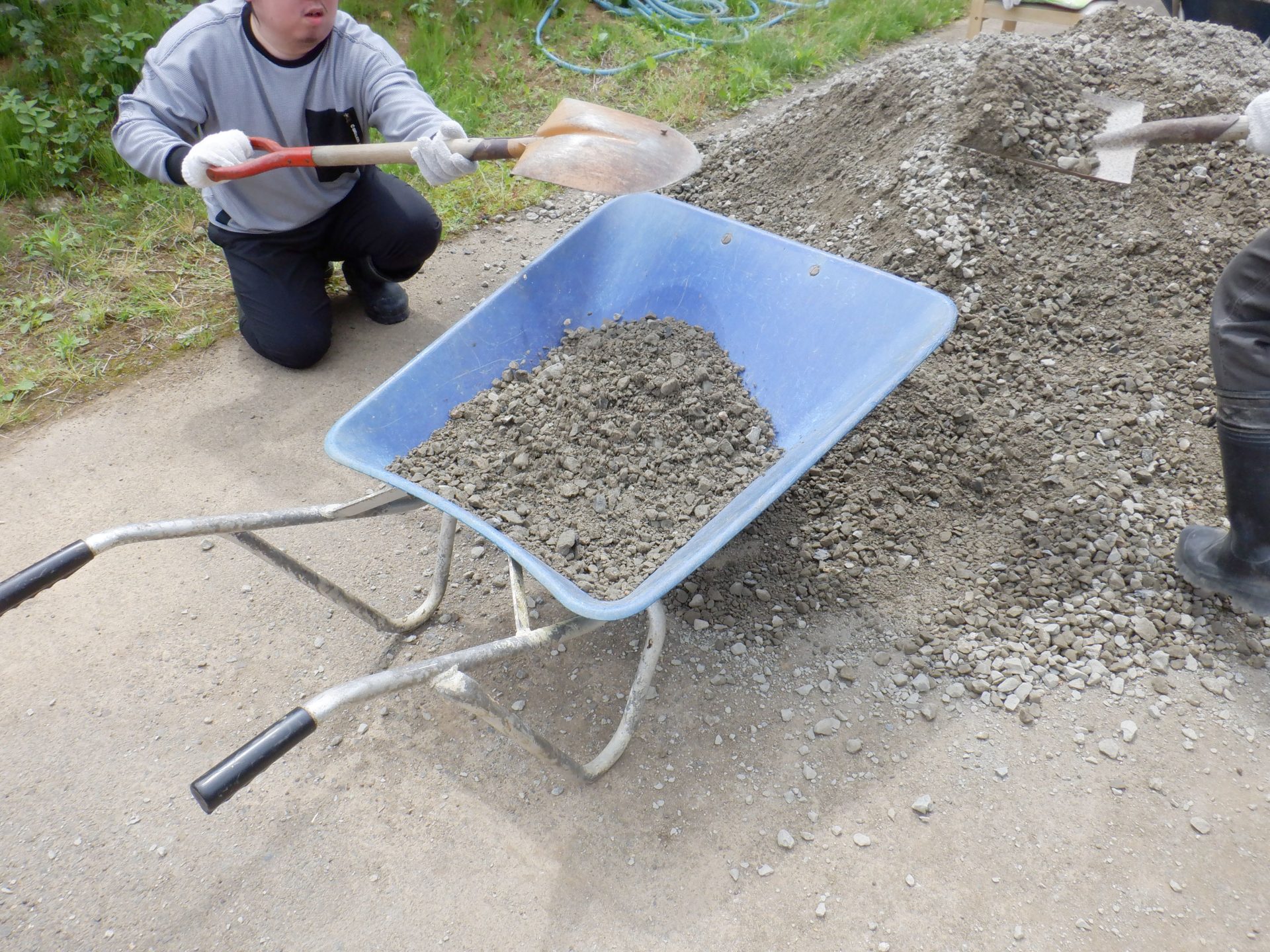 待ち構えてた利用者さんがその砂利をキレイに敷いて整地していました~(#^^#)