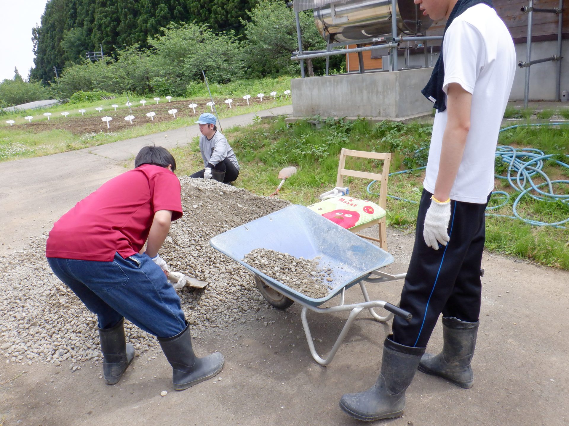 ハウス前では農芸班が砂利の運搬作業中~(´▽`*)