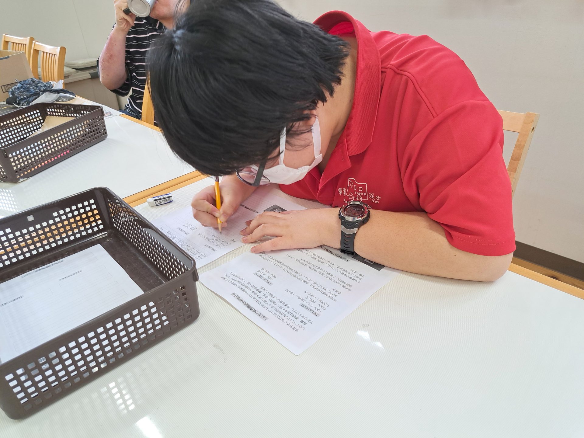 相談室では施設長が注連をまとめる作業中~順調で嬉しいですね!