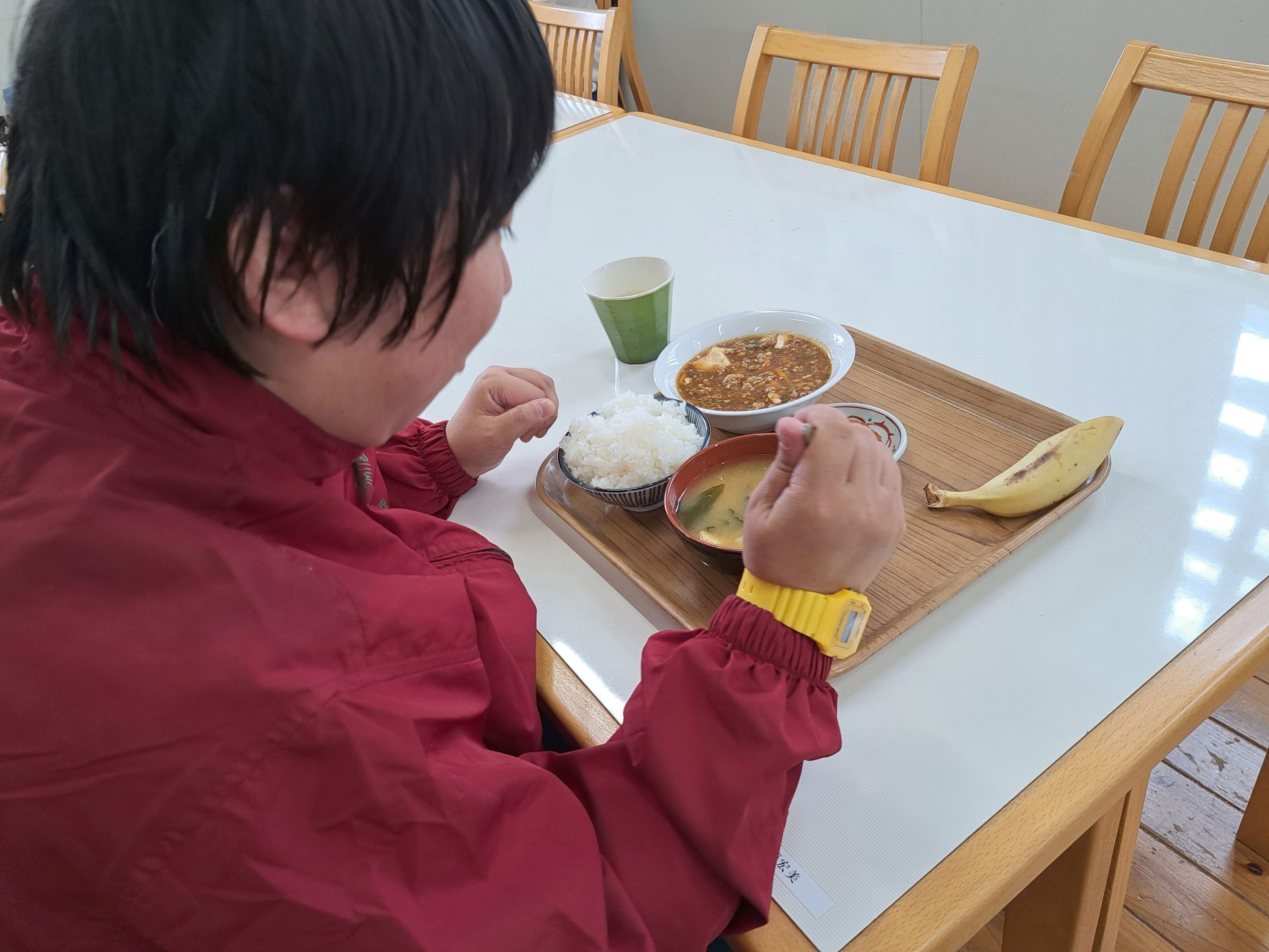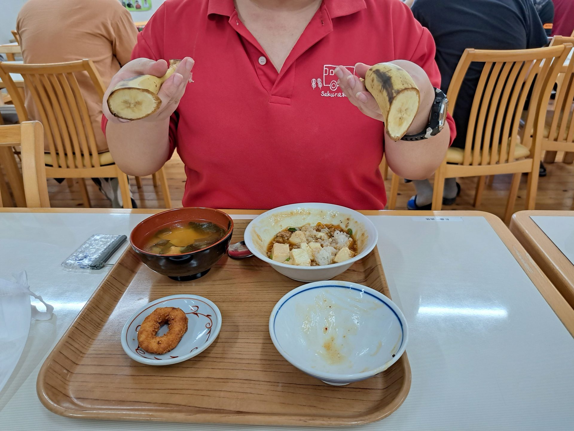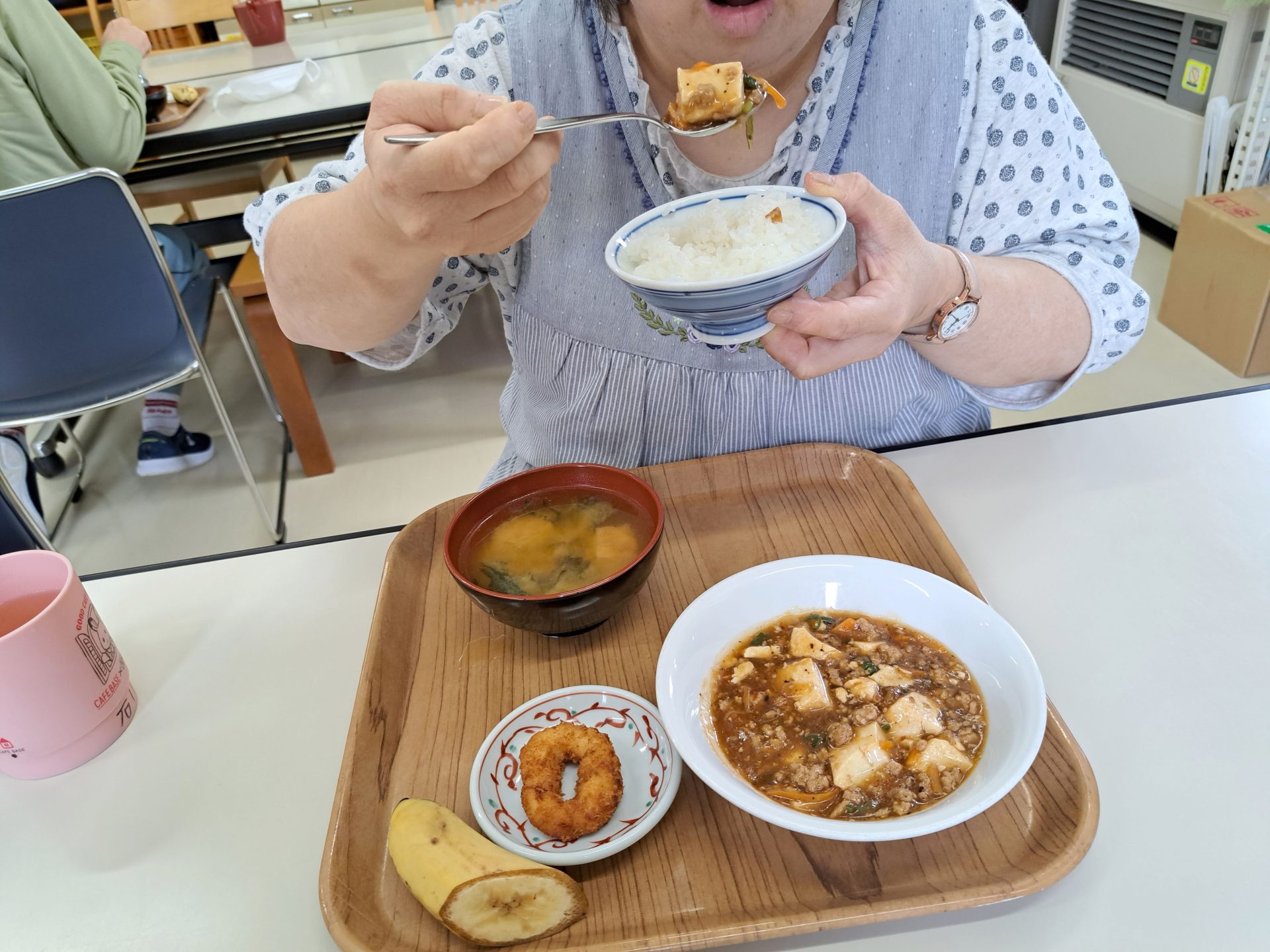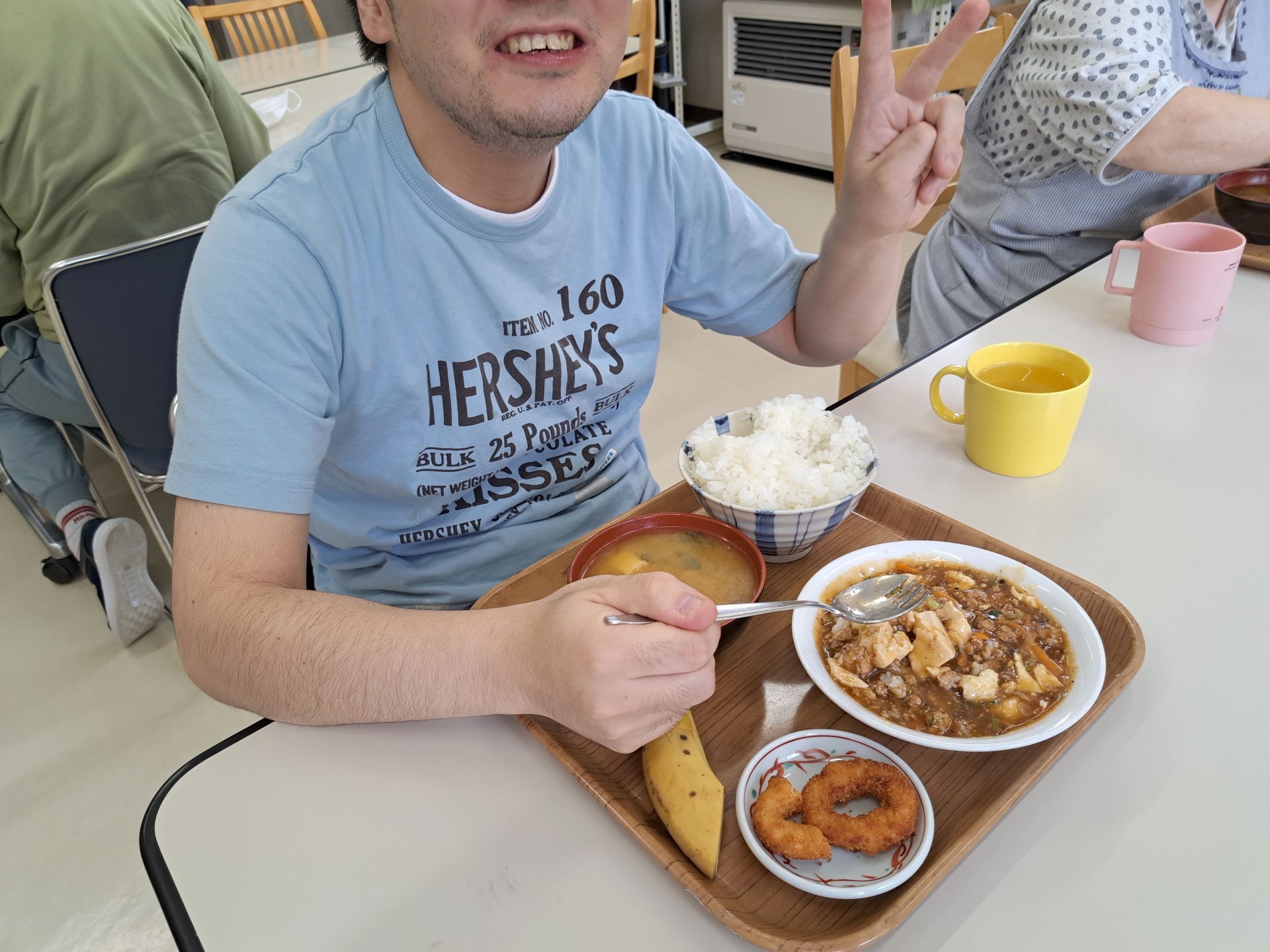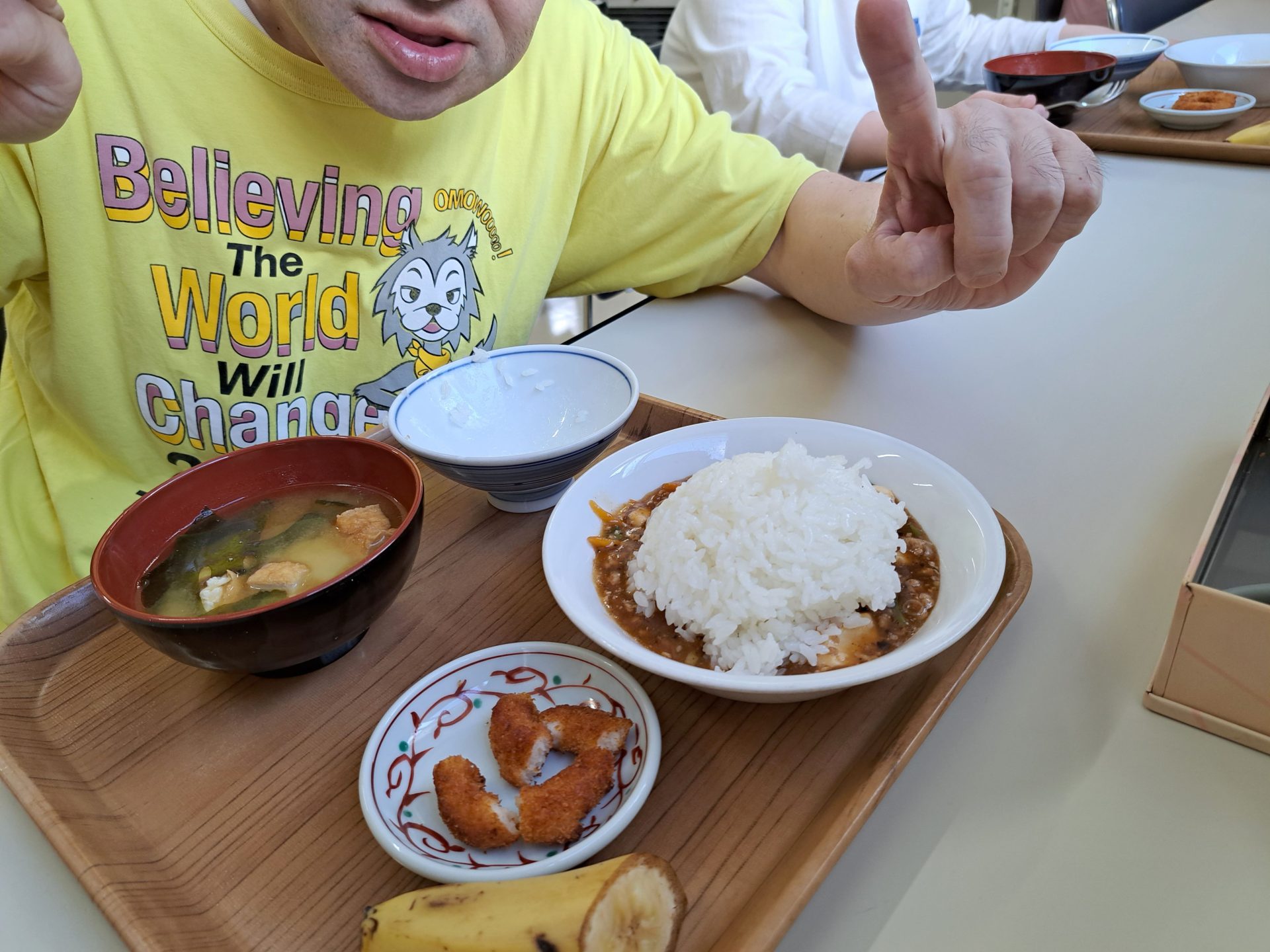はい!給食できましたよ~今日はマーボー豆腐と揚げ立てイカリングとバナナも付いてる~♡(#^^#)