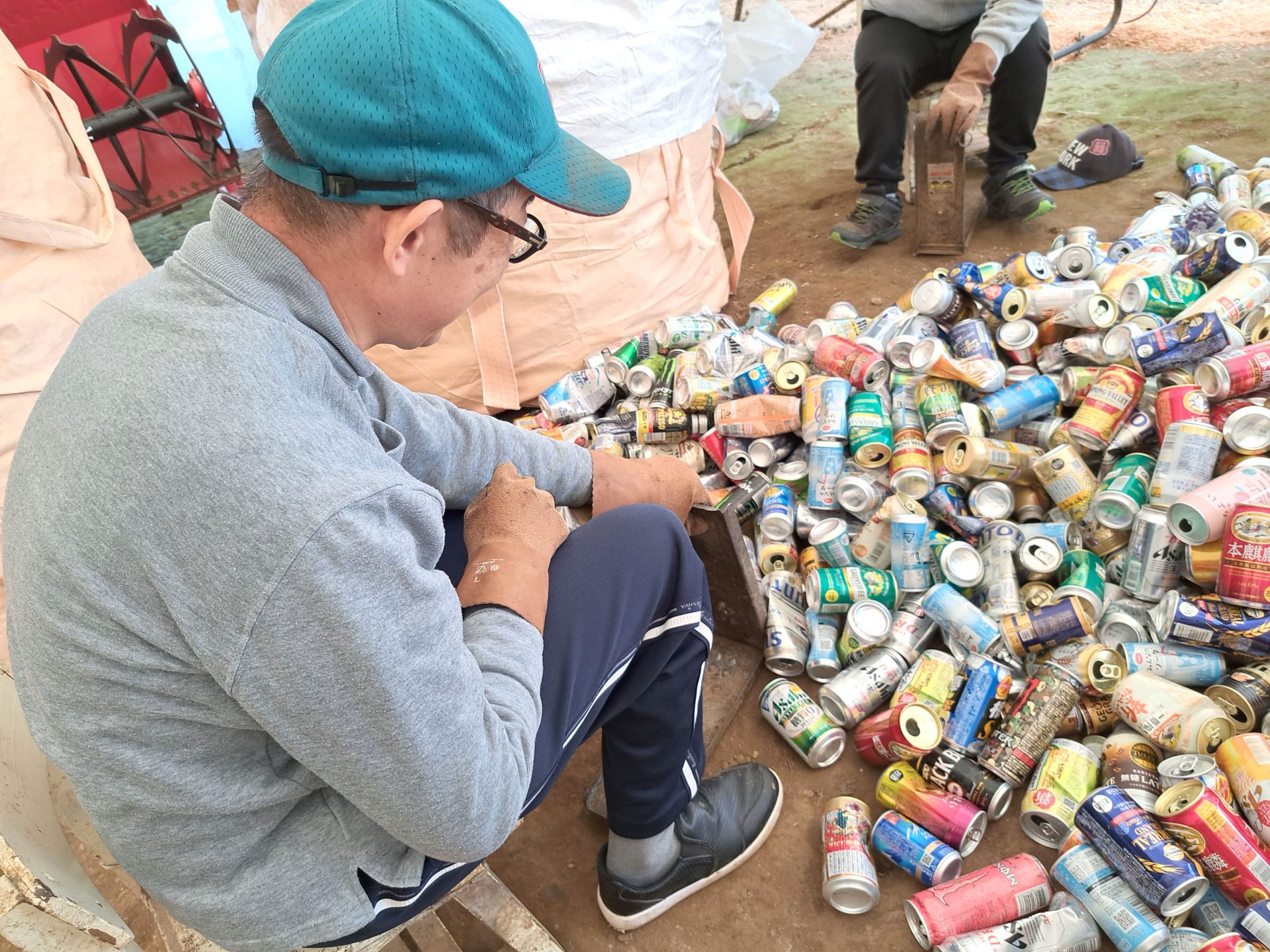 木工班はハウスの半分で空き缶つぶし~(´▽`*)