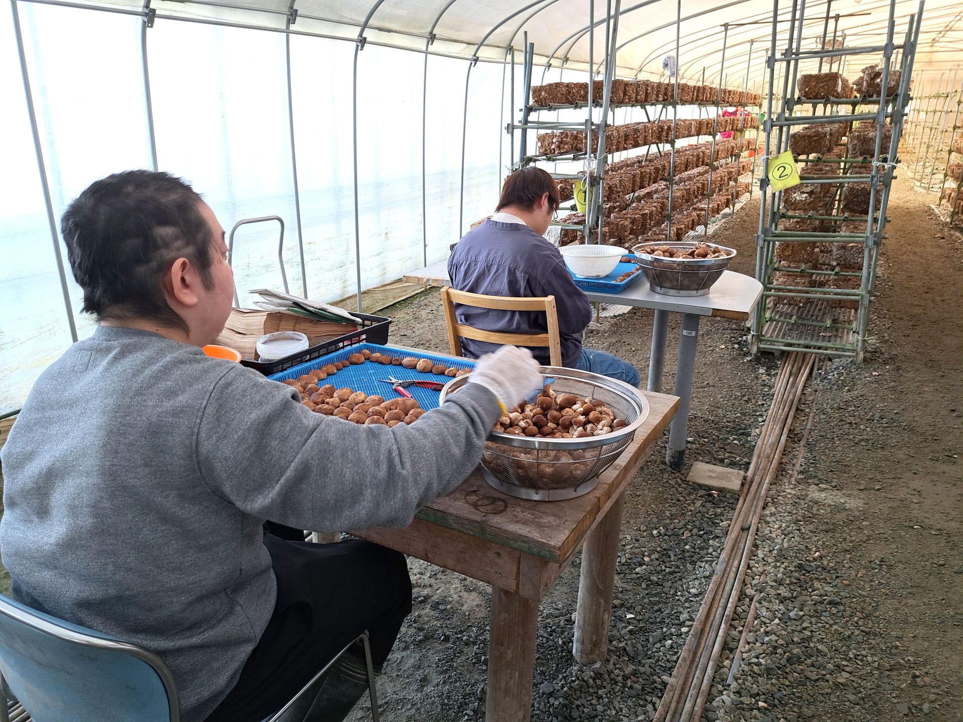 - ハウスでは新しい菌床開けますよ~