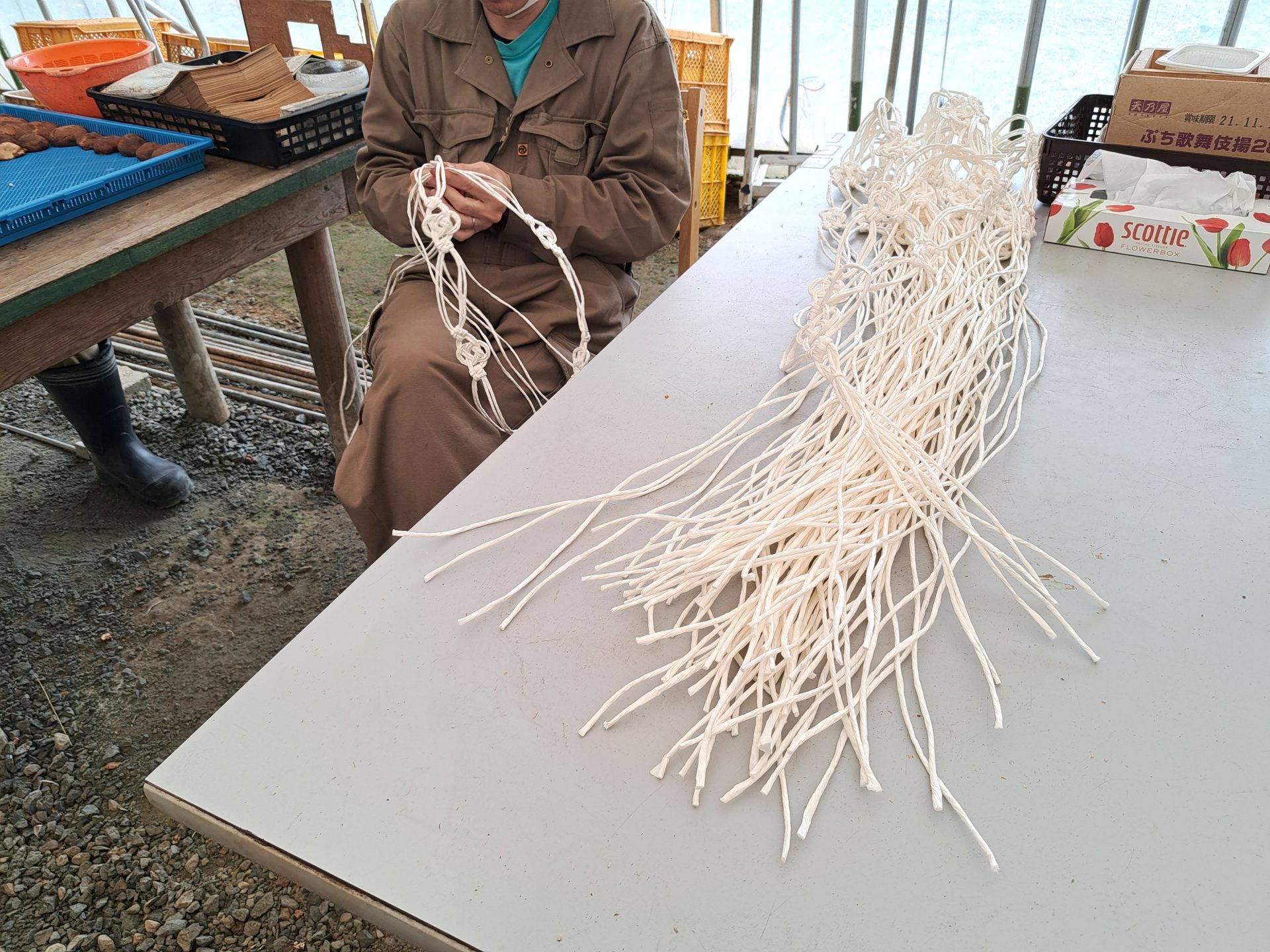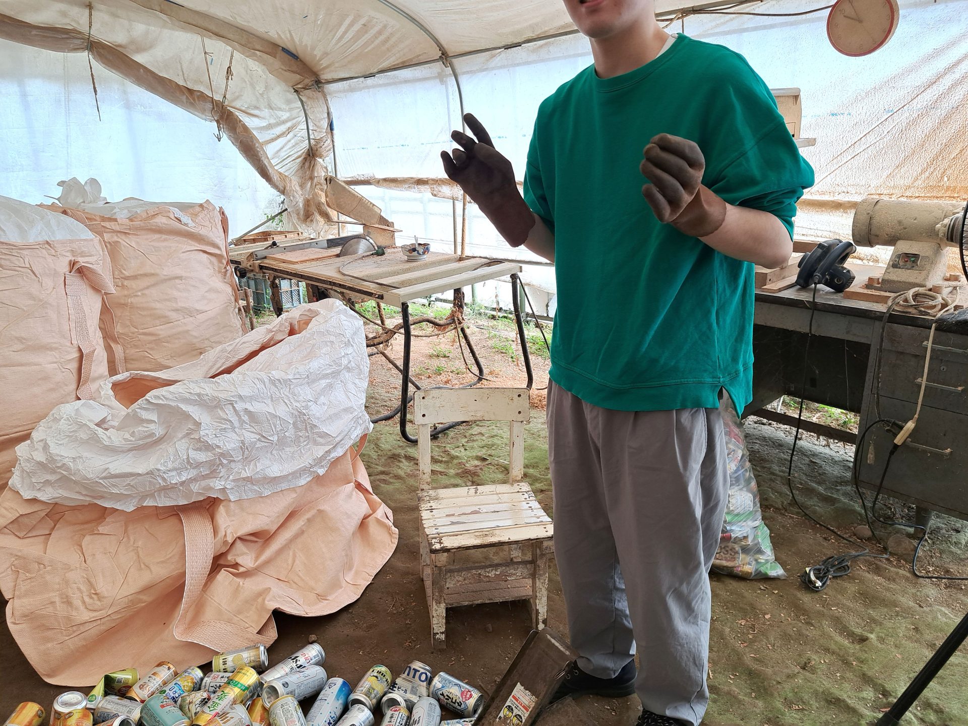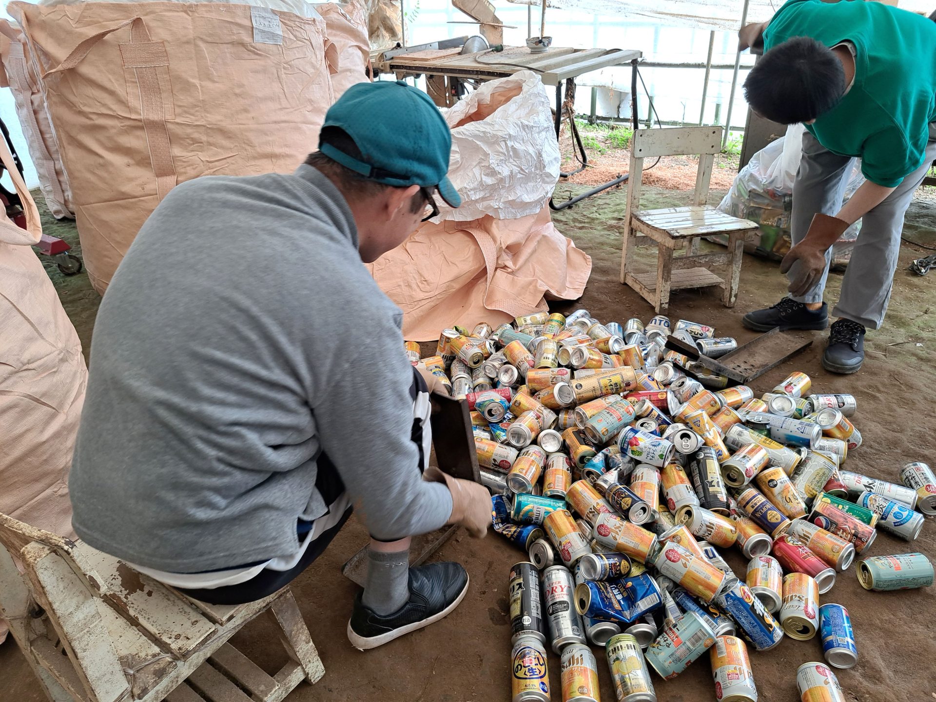 ハウスではいつもの空き缶潰しもスタート!