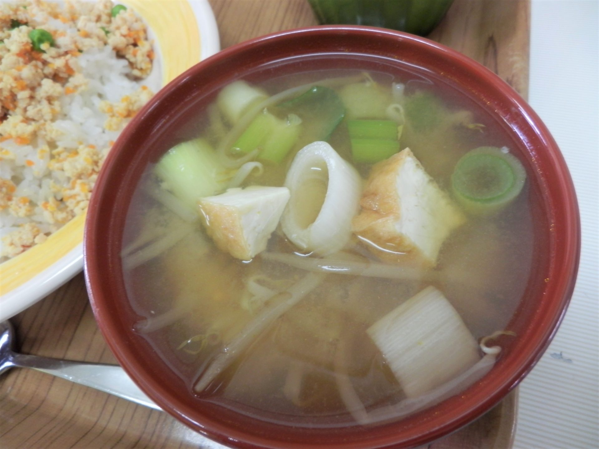 出勤途中の創造の森の八重桜~雨上がりの青空をバックにとってもきれいです(*´ω`*) さあ、今週もがんばるぞ~! 週末のおうちご飯もいいですが、月曜日にさくらが丘へ出勤するとすぐに給食メニュー表をチェックしてしまうのは私だけではないはず! 今日の給食は~ 鶏そぼろドン!…もとい…丼! 月曜日だから張り切ってお仕事したから、お腹ペコペコです~♪ 紅ショウガたっぷり♪ 具沢山ありがとう! 野菜パリパリ~♪ 今週も元気にがんばります!