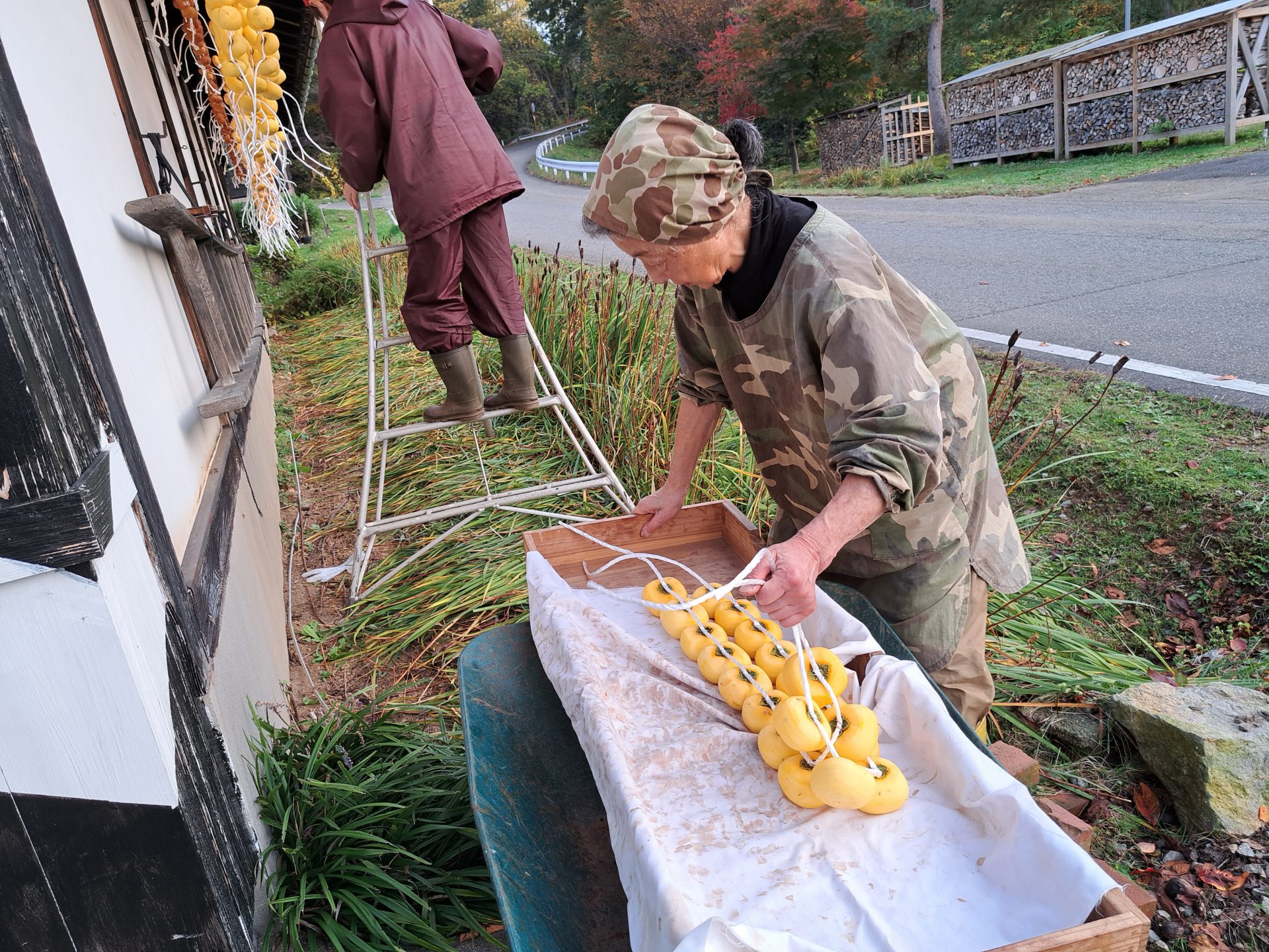 小屋の中ではご近所さんで協力して何日もかけて干し柿を作ります。