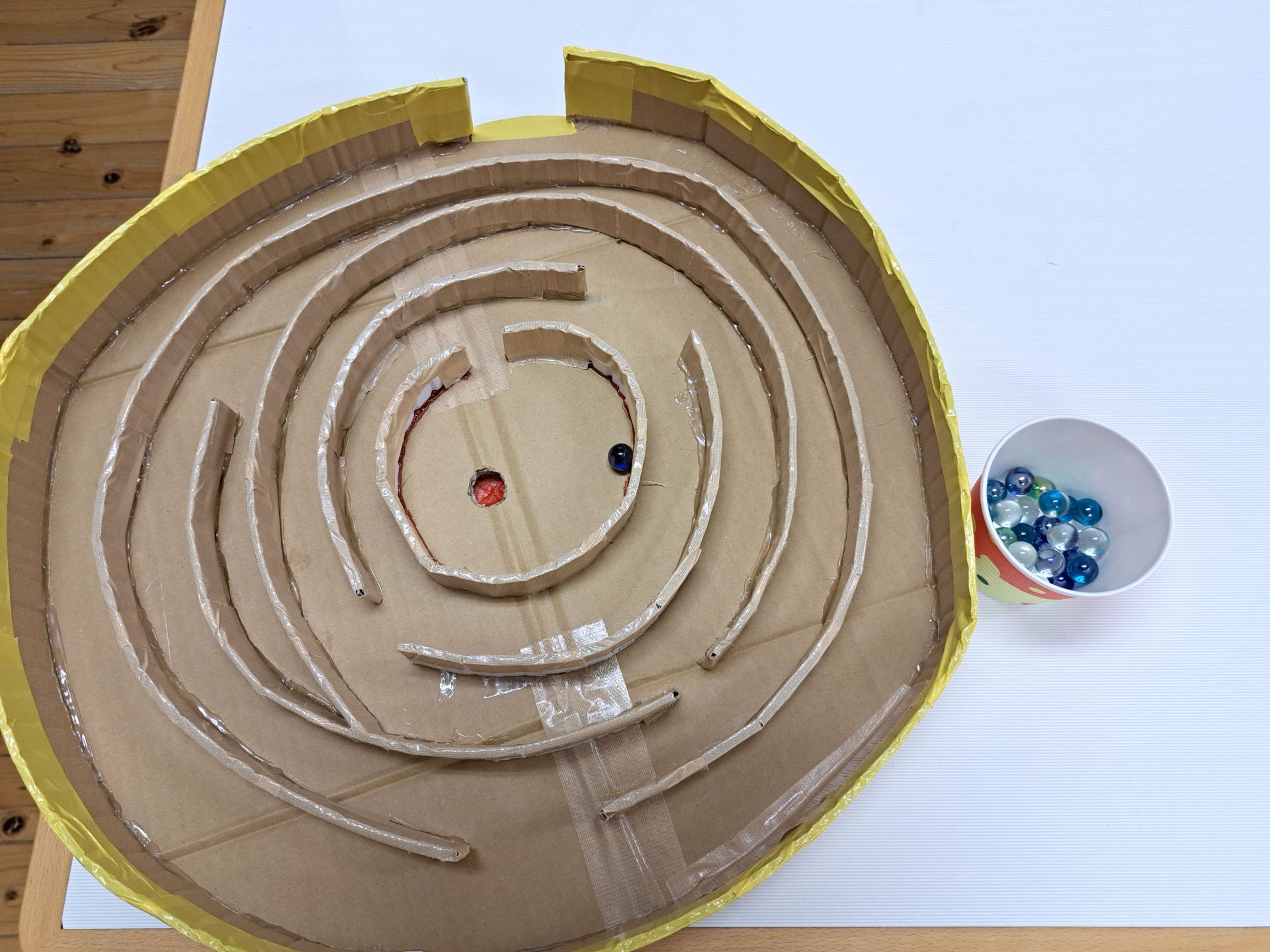 - 3人一組でビー玉を真ん中の穴まで運んで入れるんだけど…