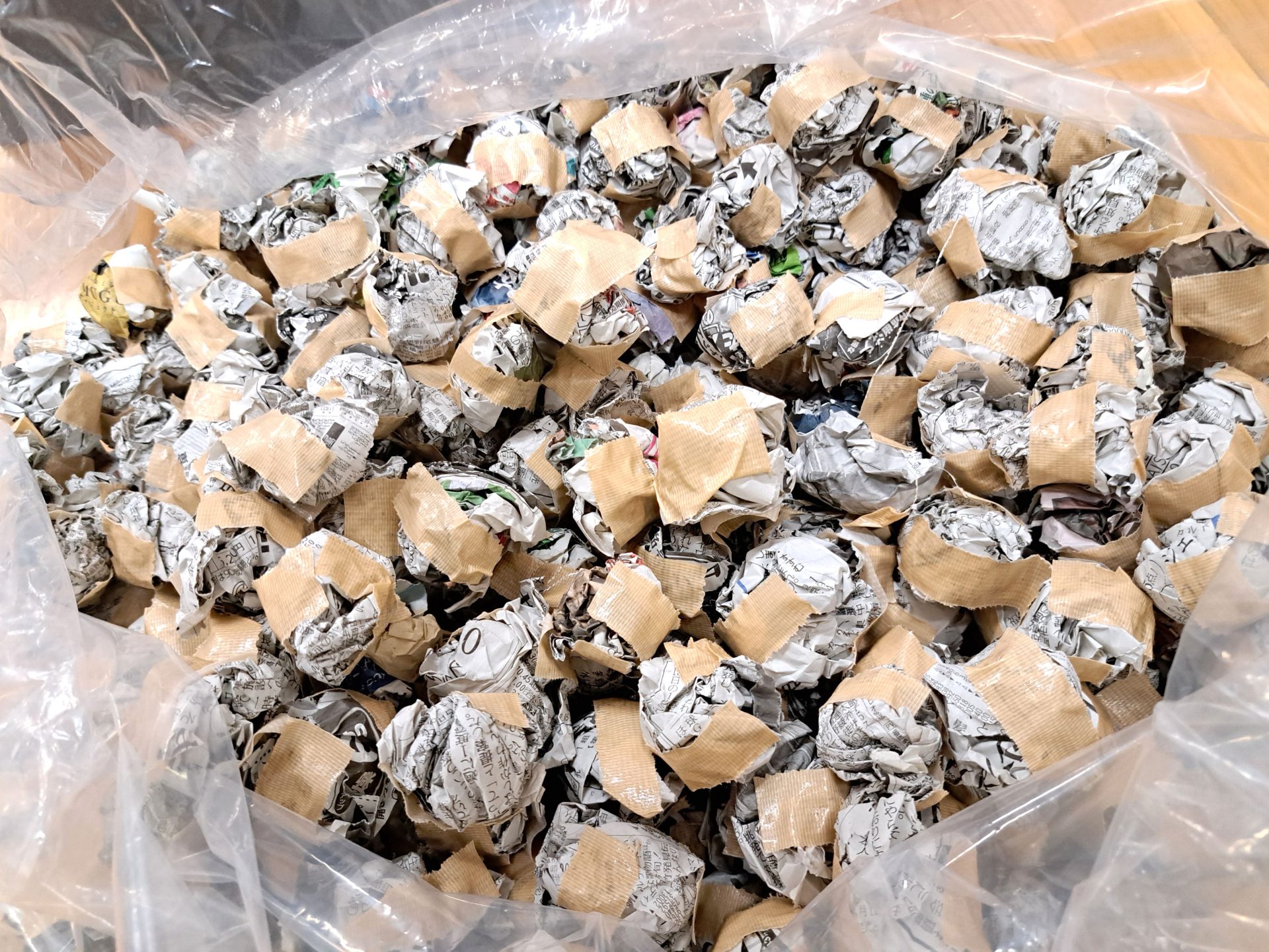 - 利用者さんが何日もかけて作ってくれた新聞紙ボール!