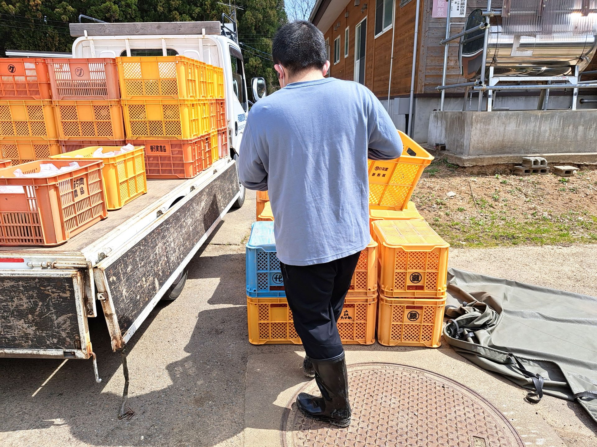 トラックの荷台に乗って荷物を下します~!