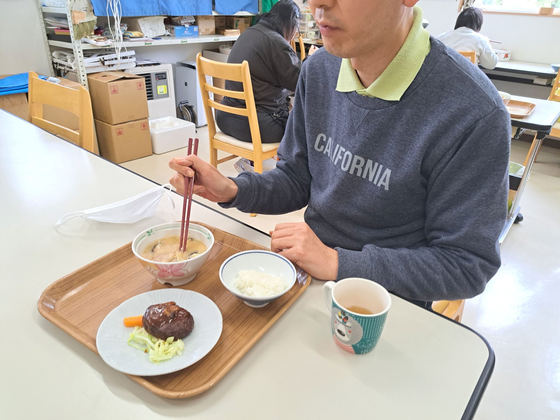 その奥で組み立てのイスを利用者さんと一緒に作っている施設長~