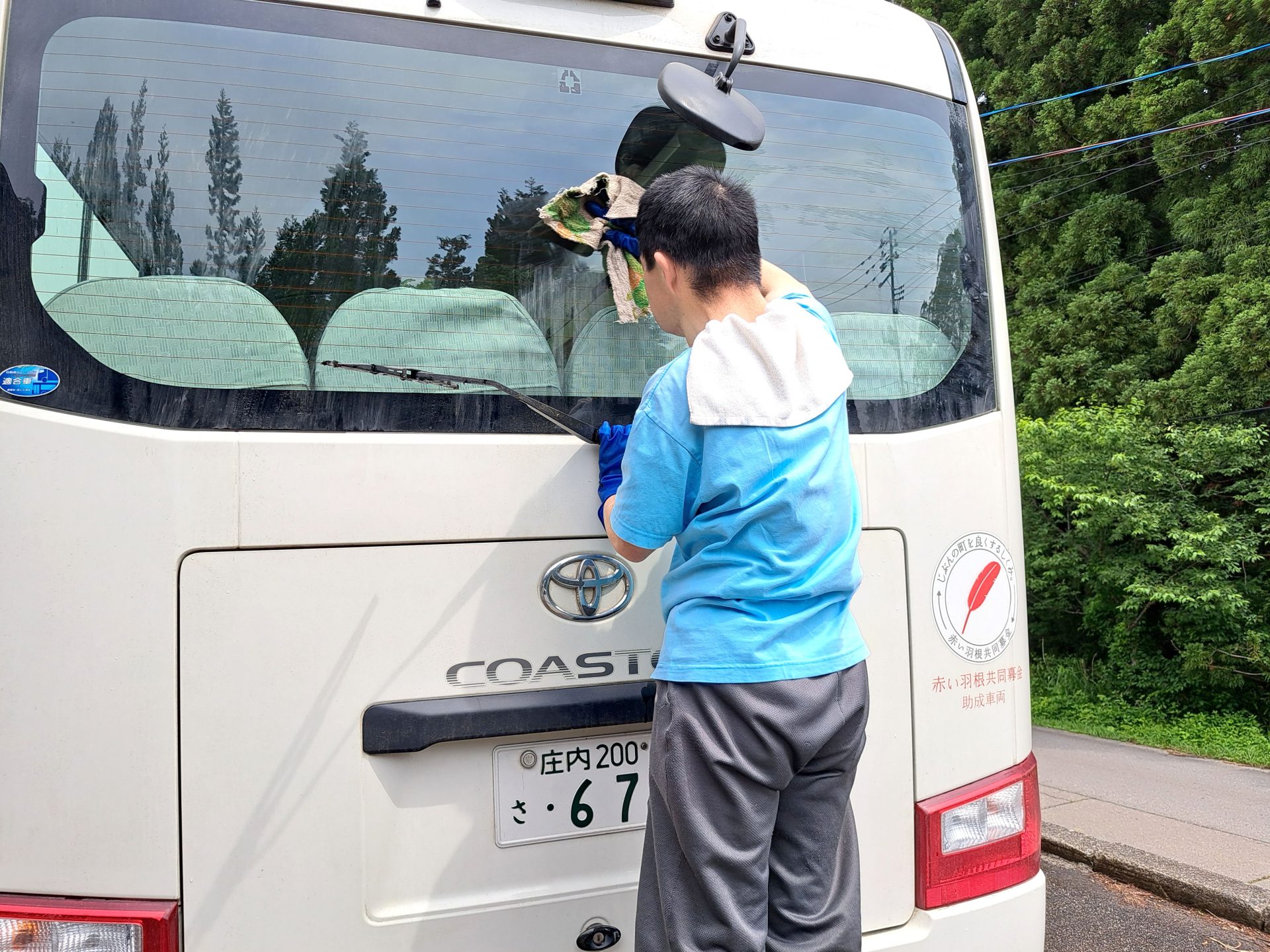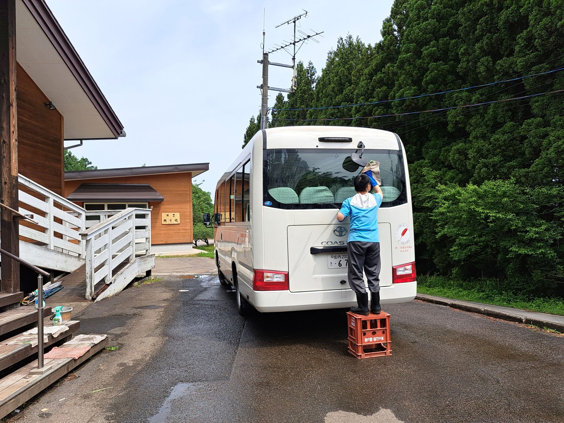 ハウスから戻る途中、電信柱に絡まったツタを撤去中の施設長~