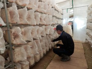 4月に入って来た菌床が真っ白になりました。この状態になったら、横になっていた菌床を立てて菌が菌床全体に回るようにします。今度は菌床が白から茶に色が変わります。高めの所にある菌床もありますので、身長が高い利用者にお願いすることが多い作業です。