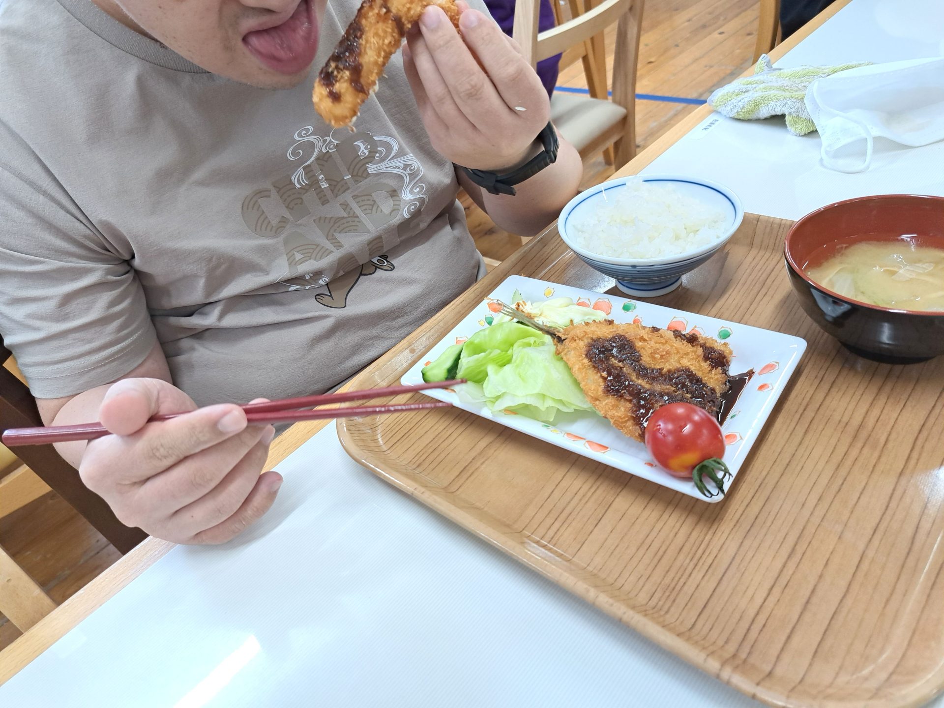 炊き立てご飯にお味噌汁~エビフライとお魚フライにソースをタップリかけて頂きます!