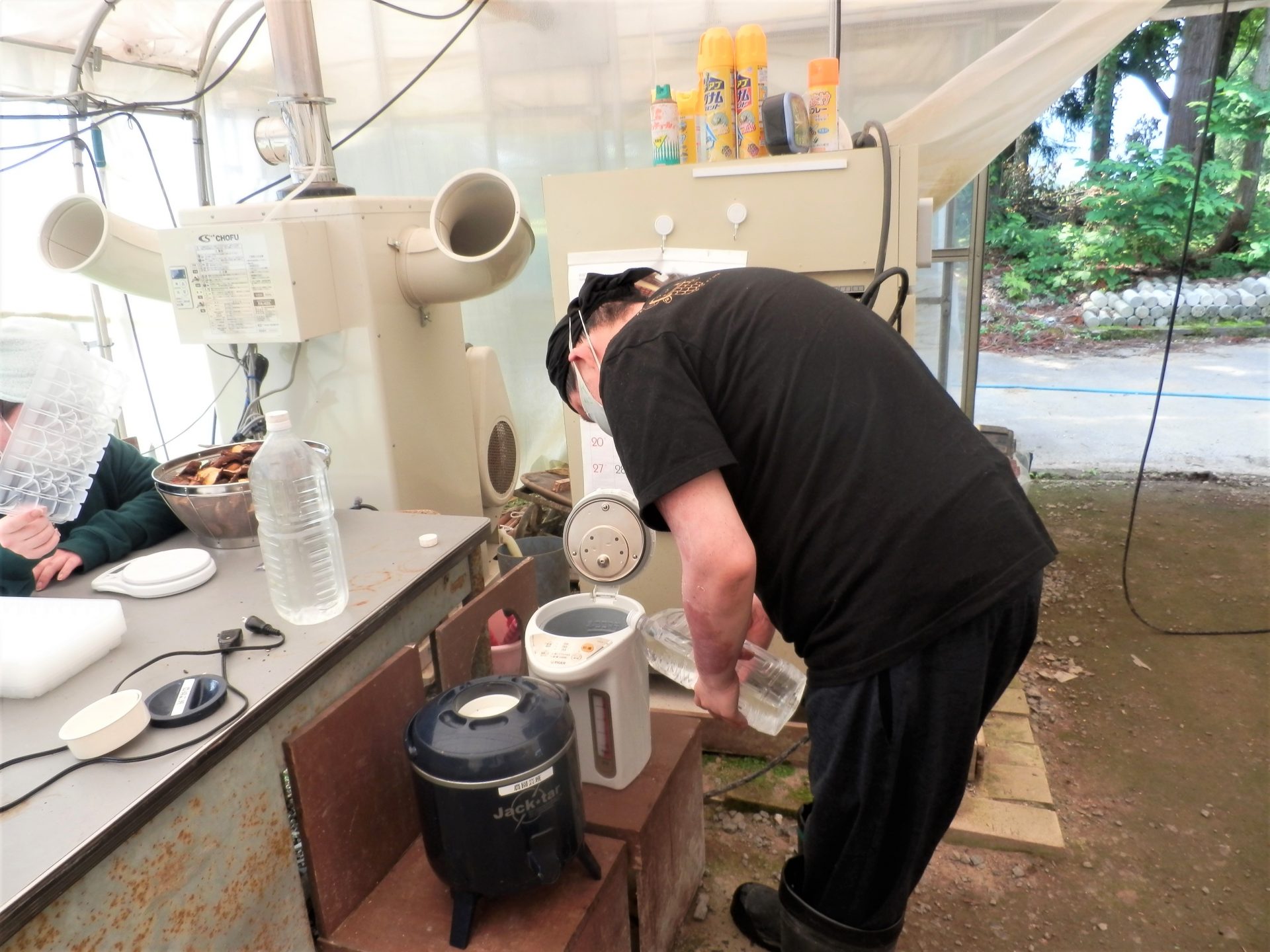 ハウスへ行くと、休憩のお湯を沸かす準備をしている利用者さん。