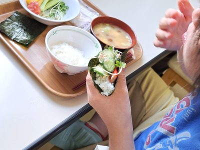 今日もシャンプー詰めがんばってますね!朝は?「自分で握ったおにぎりだ!」